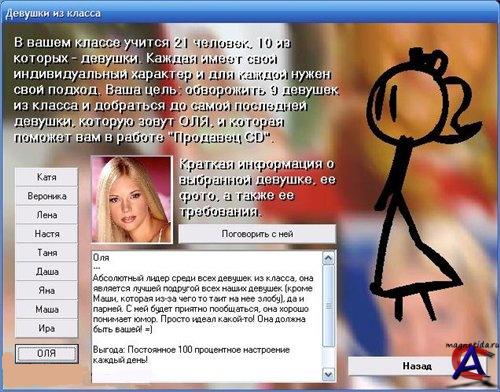 Симулятор школьника Год выпуска: 2005 Жанр: Симулятор Разработчик: Cahe-p Системные требования: СИСТЕМНЫЕ ТРЕБОВАНИЯ Ну какие системные требования могут быть у этой игры? Вот примерные требования: Любой Windows (ну, почти... На Windows 3.11 может и не пойти... =)) Клавиатура Мышь Монитор с разрешением не менее 1024х768 и глубиной цвета 32 бита. Звуковая карта Колонки или наушники Место на HDD не менее 30 мегабайт. Тип издания: пиратка Язык интерфейса: только русский Таблэтка: Не требуется Описание: ОПИСАНИЕ ИГРЫ В данной игре вы играете за обычного ученика из 9 класса. Он только что переехал вместе со своей семьей в другой город и по-этому не знает ничего, ни местных авторитетов, ни местных учителей, одним словом, нифига он не знает... (Прямо как вы, когда запустите первый раз игру =). Начиная с 1 сентября в игре вы будете: общаться с девушками из вашего класса, а также с вашей собственной матерью, будете работать на работе, отвечать на вопросы учителей и получать за это оценки в дневник; если нужно, будете либо покупать, либо пытаться тащить ГДЗ из магазина, будете следить за такими параметрами, как "Настроение","Сытость" и "Бодрость" (еще бы, ведь жизнь школьника, это сплошное недоедание, недосыпание и постоянное падение настроения, знаете ли), будете учиться драться и становится авторитетом, будете заниматься гоп-стопом или наоборот, будете жертвой гоп-стопа, будете играть в Half-Life 2, будете копить деньги в копилке, купите 1 из 18-и мобильников, доступных в игре, (причем мобилки разных фирм, таких как: Motorola, Samsung, Siemens, Nokia и др.), а когда купите, будете играть на нем в Java-игры, обмениваться SMS-ками с другими людьми... Плюс ко всему в течение всей игры вас будут сопровождать прекрасные лирические мелодии, специально подобранные мной для этой игры. =) А в конце игры вы увидете одну из 5-ти концовок, которые есть в игре (резко вспоминается известная серия Silent Hill =). Любителям всяких фишек и секретов также найдется место в игре. Короче, одним словом, вот такое вот краткое описание данной игрушки. Ну как, заинтересовались? =)