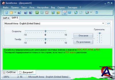 Версия: 1.32.0.466 Язык интерфейса: Multilanguage/Русский Лекарство: Не требуется Размер: 3,5 Мб ОС: Windows 2000/XP/Vista/7 Описание: Программа Балаболка предназначена для чтения вслух текстовых файлов. Для воспроизведения звуков человеческого голоса могут использоваться любые речевые синтезаторы, установленные на компьютере. Воспроизведение речи можно контролировать при помощи стандартных кнопок, подобных тем, что присутствуют в любой мультимедийной программе (воспроизвести/приостановить/остановить). Для лучшего произношения Балаболка использует словари. Суть этой задумки в том, чтобы наиболее часто употребляемые слова и слова, произносимые программой неправильно, воспроизводились по составленным заранее правилам, приближающим компьютерное произношение к человеческому. В программе также реализовано несколько дополнительных функций: проверка орфографии (средствами Microsoft Office или Spell Checker, который можно загрузить опять же с сайта программы) и двунаправленная перекодировка текста WIN-DOS.