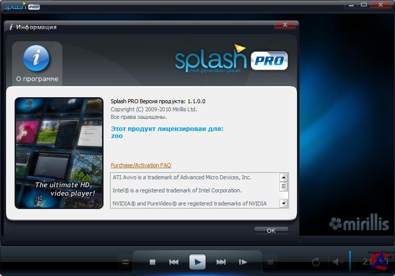 Версия: Splash PRO HD player 1.1.0.0 Portable Установка: Запускаем файл и пользуемся! Язык интерфейса: Русский Описание: Splash PRO HD player - хороший и скоростной видео плеер оптимизированный для проигрывания видео в высоком разрешении. Splash Player имеет встроенный кодек Mirillis AVC/H.264, который является собственной разработкой компании, и способен обеспечить высококачественное четкое и гладкое изображение в высоком разрешении. Плеер отличается стильным, удобным интерфейсом. Особенности программы: * Поддерживаемые файлы: AVI, MKV, MOV, M2TS, MTS, M2T, MP4, MPG, TS * Поддержка видео, с собственными кодеками: H.264, MPEG-2, VC-1 * Поддержка видео через внешние кодеки: DivX / XviD * Лучшее качество видео, благодаря программному обеспечению и аппаратному декодированию видео * Стильный пользовательский интерфейс и проста в использовании * Поддерживает аппаратное ускорение декодирования видео * 1080i преобразованием до 1080p * Поддержка многоядерных процессоров * Субтитры * Lipsync поправкой * DVB-T. Системные требования: Операционная система: Windows XP/Vista/Seven Процессор: Pentium III 1 ГГц Память: 512 МБ Видеокарта: 16 бит Свободное место на ЖД: 100 мб