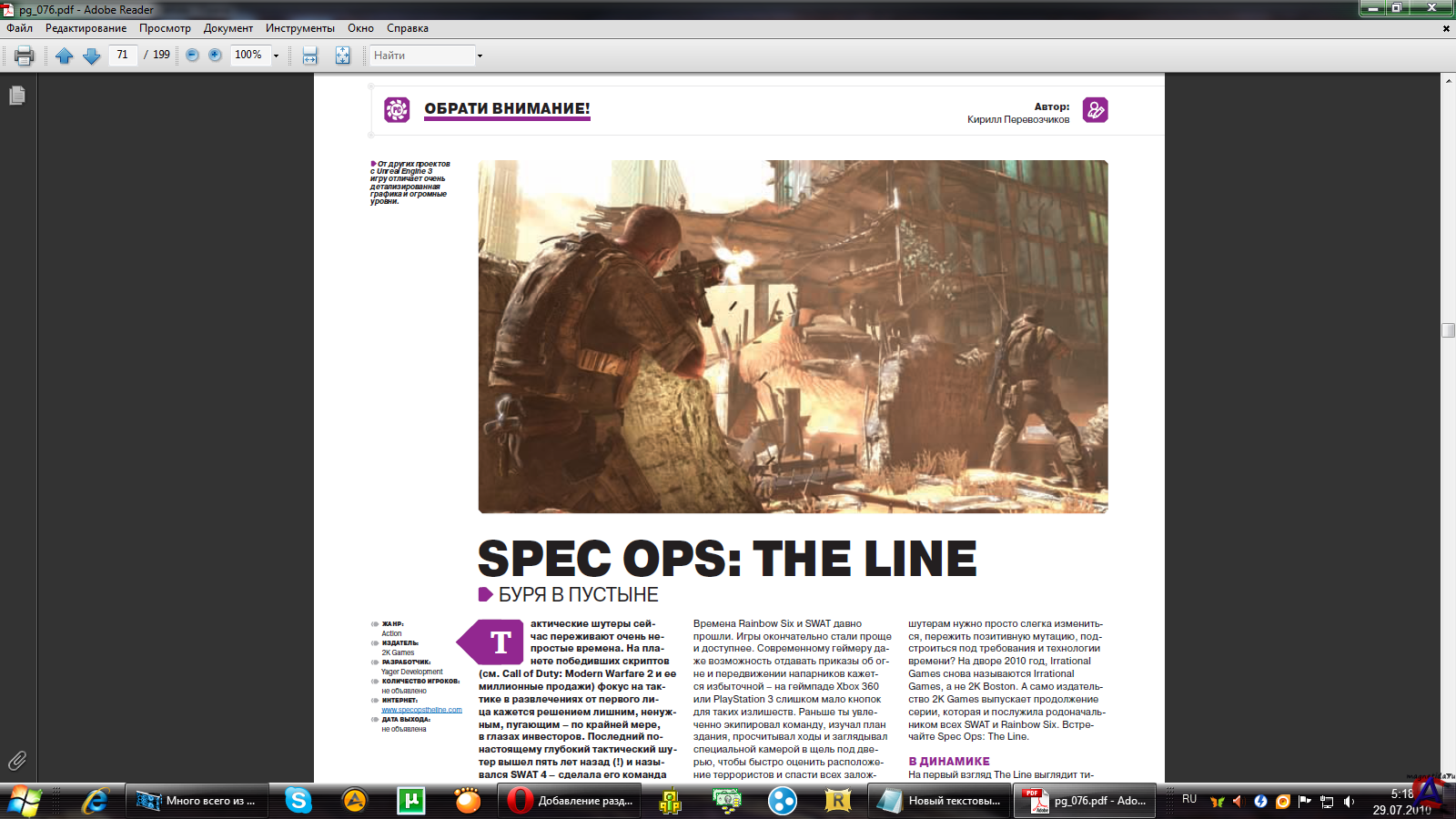 Времена Rainbow Six и SWAT давно прошли. Игры окончательно стали проще и доступнее. Современному геймеру даже возможность отдавать приказы об огне и передвижении напарников кажется избыточной – на геймпаде Xbox 360 или PlayStation 3 слишком мало кнопок для таких излишеств. Раньше ты увлеченно экипировал команду, изучал план здания, просчитывал ходы и заглядывал специальной камерой в щель под дверью, чтобы быстро оценить расположение террористов и спасти всех заложников. Сейчас достаточно спрятаться за укрытием (Rainbow Six Vegas) или ворваться в комнату ранним рэмбо, а игра сама включит slo-mo (Modern Warfare 2). Но что если время тактических шутеров еще не вышло? Что если тактическим шутерам нужно просто слегка измениться, пережить позитивную мутацию, подстроиться под требования и технологии времени? На дворе 2010 год, Irrational Games снова называются Irrational Games, а не 2K Boston. А само издательство 2K Games выпускает продолжение серии, которая и послужила родоначальником всех SWAT и Rainbow Six. Встречайте Spec Ops: The Line.