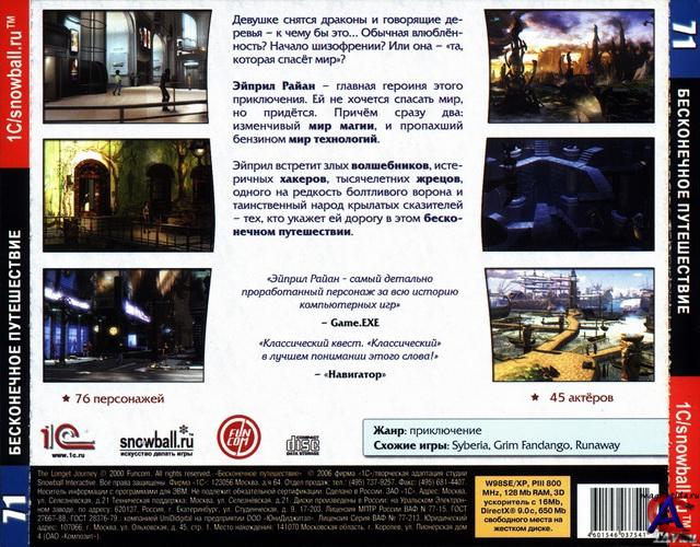 Описание: Девушке снятся драконы и говорящие деревья - к чему бы это… Обычная влюблённость? Начало шизофрении? Или она - очередная Избранная, которой нужно спасти мир? Эйприл Райан (18 лет, художница, не замужем) – главная героиня этого приключения. Ей не хочется спасать мир, но придётся. Причём сразу два: сказочный мир магии, и пахнущий бензином мир технологий. Бесконечное путешествие сведёт её со злыми волшебниками, психованными хакерами, тысячелетними жрецами, одним на редкость болтливым вороном и прочими колоритными личностями. Кто из них друг, кто – враг, а кто - лишь игра воображения, покажет финал. Особенности игры: - Сюжет, достойный высокобюджетного фантастического фильма. - Более 150 тщательно прорисованных локаций, расположенных в двух непохожим мирах. - Более 70 озвученных персонажей. - Живая анимация персонажей, созданная с помощью технологии Motion capture. - Высококачественные видеоролики общей продолжительностью в 20 минут.