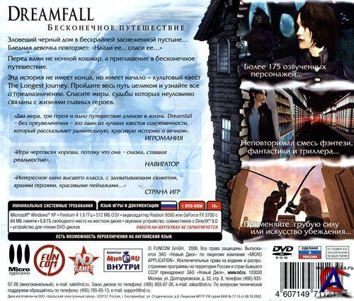 Описание: Долгожданная русская версия игры вновь приглашает всех ценителей хороших приключений в дивные параллельные миры. Величественные леса, шумные города и золотистый песок лазурных побережий – прекрасное обрамление для великолепного захватывающего сюжета, связывающего судьбы трех главных героев. В игре «Dreamfall: Бесконечное путешествие» удачно соединены несколько жанров. Кроме логических головоломок игроку предстоит использовать силу и ловкость героев в битвах с хитрыми монстрами, искать обходные пути, полагаясь на скрытность, или добиваться своего словами в разговорах с персонажами. Многие отечественные и западные журналисты назвали «Dreamfall: Бесконечное путешествие» одной из лучших игр 2006 года. Игра вышла в полностью локализованной версии. Рекордное число «говорящих» персонажей – 175 – озвучили 35 профессиональных актеров. 70 часов работы в студии превратились в более чем 10 часов русского звука. Для гурманов и любителей «оригинальных версий» есть опция отключения перевода.