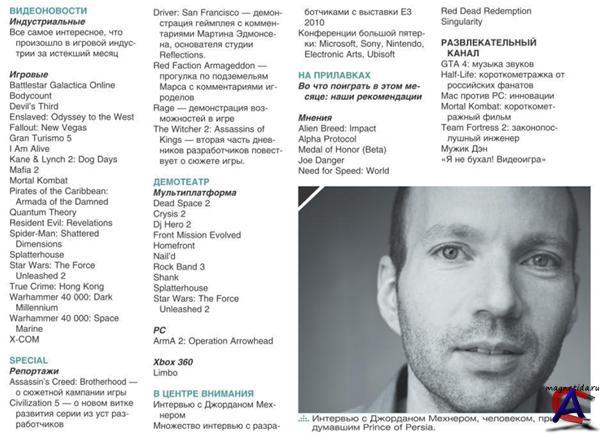Описание: МАРАФОН E3 Конференции Microsoft, Electronic Arts, Ubisoft, Nintendo, Sony ВИДЕО НОВОСТИ Все самое интересное, что произошло в игровой индустрии за истекший месяц ДЕМОТЕАТР МУЛЬТИПЛАТФОРМА Dead Space 2 Crysis 2 Dj Hero 2 Front Mission Evolved Homefront Nail"d Rock Band 3 Shank Splatterhouse Star Wars: The Force Unleashed 2 Super Meat Boy Vanquish PC ArmA 2: Operation Arrowhead Xbox 360 Guild Wars 2 Jumpgate: Evolution В ЦЕНТРЕ ВНИМАНИЯ Интервью с Джорданом Мехнером Мнение Александра Кузьменко, Игоря Асанова и Максима Еремеева о Red Dead Redemption НА ПРИЛАВКАХ ВО ЧТО МОЖНО ПОИГРАТЬ В ЭТОМ МЕСЯЦЕ: НАШИ РЕКОМЕНДАЦИИ, МНЕНИЯ Alien Breed: Impact Medal of Honor (Beta) Joe Danger Need for Speed: World Singularity Sniper: Ghost Warrior Transformers: War for Cybertron РАЗВЛЕКАТЕЛЬНЫЙ КАНАЛ GTA 4: музыка звуков Half-Life: короткометражка от российских фанатов Left 4 Dead 3: Soccermoms Mac против PC: инновации Mortal Kombat: короткометражный фильм Team Fortress 2: законопослушный инженер Кевин Батлер Клип Poets of the Fall на песню War Мужик ДэнShare В Мой Мир