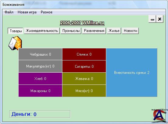 Название: Симулятор бомжа v1.4 Тип издания: лицензия Жанр: Симуляторы Разработчик: wmline Год: 2010 Платформа: PC Язык интерфейса: русский Таблетка: не требуется Системные требования: RAM: 32MB Видеокарта: 16MB Свободное место на ЖД: 30MB DVD-привод: 8х Описание: Эта игра представляет собой симулятор жизни нищего. Для Вас доступны следующие возможности: сбор милостыни, поиск мусора в помойках, торговля на рынке, игровой автомат и много другое.