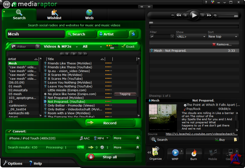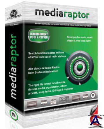 ОС: Windows 2000/XP/Vista/7 Язык интерфейса: Английский Лекарство: Присутствует (serial) Размер: 50,4 Мб Mediaraptor Platinum - мощный аудио и видео-поисковым инструмент, который позволяет найти музыкальные треки и видео клипы из разных интернет-радиостанций и других источников. Вы можете осуществить поиск по названию или по имени исполнителя, найти новую музыку по жанру и автоматически записывать потоковое медиа во время поиска YouTube, Google Video и других подобных сайтах. Другие функции включают комплексные средства конвертирования, редактирования ID3 тегов, записи файлов на CD диск и многое другое.Программа автоматически записывает, видео клипы и музыку, которые вы искали в интернете. Комплексный конвертор позволяет автоматически конвертировать файлы в нужный формат для вашего устройства для воспроизведения, MP3, WMV, MP4, AVI. Просто выберите ваше устройство воспроизведения и записи, и программа позаботится об остальном. В программе есть возможность записи файлов на CD диск. Mediaraptor is today’s cutting-edge solution for targeting and recording music at turbo speed from social music platforms. Simply enter the artist, genre or song title and Mediaraptor starts searching millions of files for MP3 music – complete with ID3 tags, cover art and even lyrics. The Mediaraptor MusicFinder fulfills your musical wishes by scanning thousands of web radio stations. let"s meet on zhmak.info The Mediaraptor web recorder automatically records all of the music and videos you have previously enjoyed at various social radio and video portals. Create an MP3 or music video collection automatically from social web radios using the wish list. Video clips are automatically converted in the appropriate file format for every device.