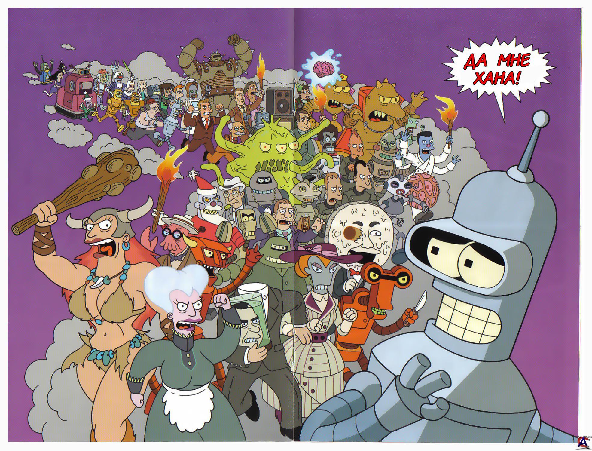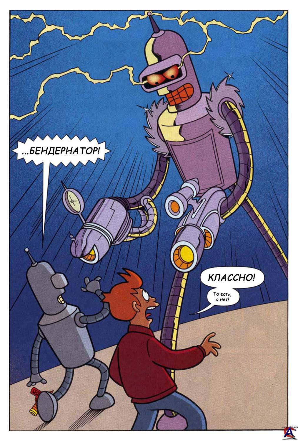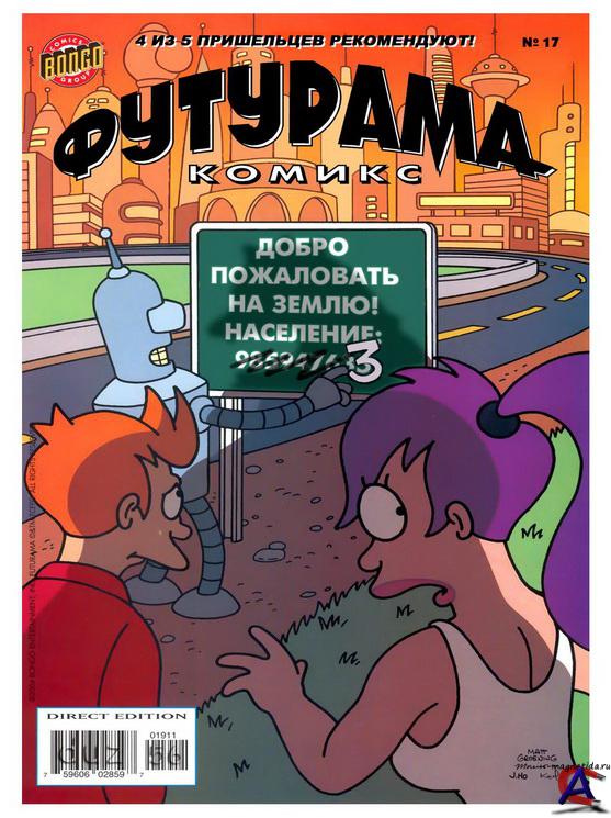 Жанр: Комедия, Фантастика Издательство: Bongo Язык: русский Формат: Jpg Обьем: 36 + Спецвыпуск + 4 части кроссовера "Футурама-Симпсоны" + 2 фан-комикса. Описание: Разносчик пиццы из Нью-Йорка Филип Джей Фрай случайно, был заморожен в криогенной камере ровно в 00 часов 00 минут 00 секунд 1 января 2000 года. Он был разморожен тысячу лет спустя, 31 декабря 2999 года, и обнаружил себя в городе будущего Нью-Нью-Йорке. Устраиваеться на работу в небольшую компанию его пра-пра-пра-…-пра-внучатого племянника Хьюберта Фарнсворта «Межпланетный экспресс», занимающуюся межгалактическими грузоперевозками, на должность курьера.