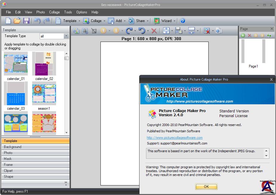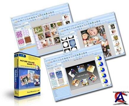 ОС: Windows 2000/XP/Vista/7 Язык интерфейса: Английский Лекарство: Присутствует (keygen) Размер: 50,5 Мб Picture Collage Maker - простая в использовании программа для создания коллажей из ваших фотографий. Простой интерфейс программы и множество шаблонов позволят легко создавать разнообразные фотоколлажи (календари, поздравительные открытки, пригласительные билеты, постеры и т.д.) даже неопытным пользователям. Создание коллажей - это расслабляющее время-провождение, помогающее превращать собранные фотографии в драгоценные воспоминания. Это самый легкий способ создания коллажей с применением вращений, изменения размеров, положений, обрамлений, маскировки, слияния и применением различных эффектов для каждой картинки по-отдельности. Результат может быть сохранен в форматах JPG, BMP, TIFF, GIF, WMF, TGA, PNG или установлен в качестве фонового рисунка для рабочего стола.