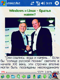 Версия: v 2.5.090627 Активация: Бесплатна для русскоязычных пользователей. Язык интерфейса: + русский Описание: AlReader — универсальная программа для чтения на устройствах под управлением Windows, Windows Mobile и Windows CE. Обладает огромным множеством функций, высокой гибкостью настроек, поддержкой скинов и профилей. Поддерживаемые форматы чтения: FB2, TXT, RTF, HTML, CHM, PDB/PRC, TCR; DOC, DOCX, ODT, SXW, ABW, ZABW - чтение текста, с отображением картинок; чтение из архивов ZIP, GZ, RAR (частично); Поддержка изображений в формате JPG, PNG, GIF, BMP. Форматы EMF и WMF поддерживаются только для Win2000, XP, Vista, 7. Работа со словарями Dict, Lingvo и Slovoed Совместимость: Pocket PC 2002, WM 2003, WM5/6, WinCE (от 4.20), Win2000/XP/Vista/7.