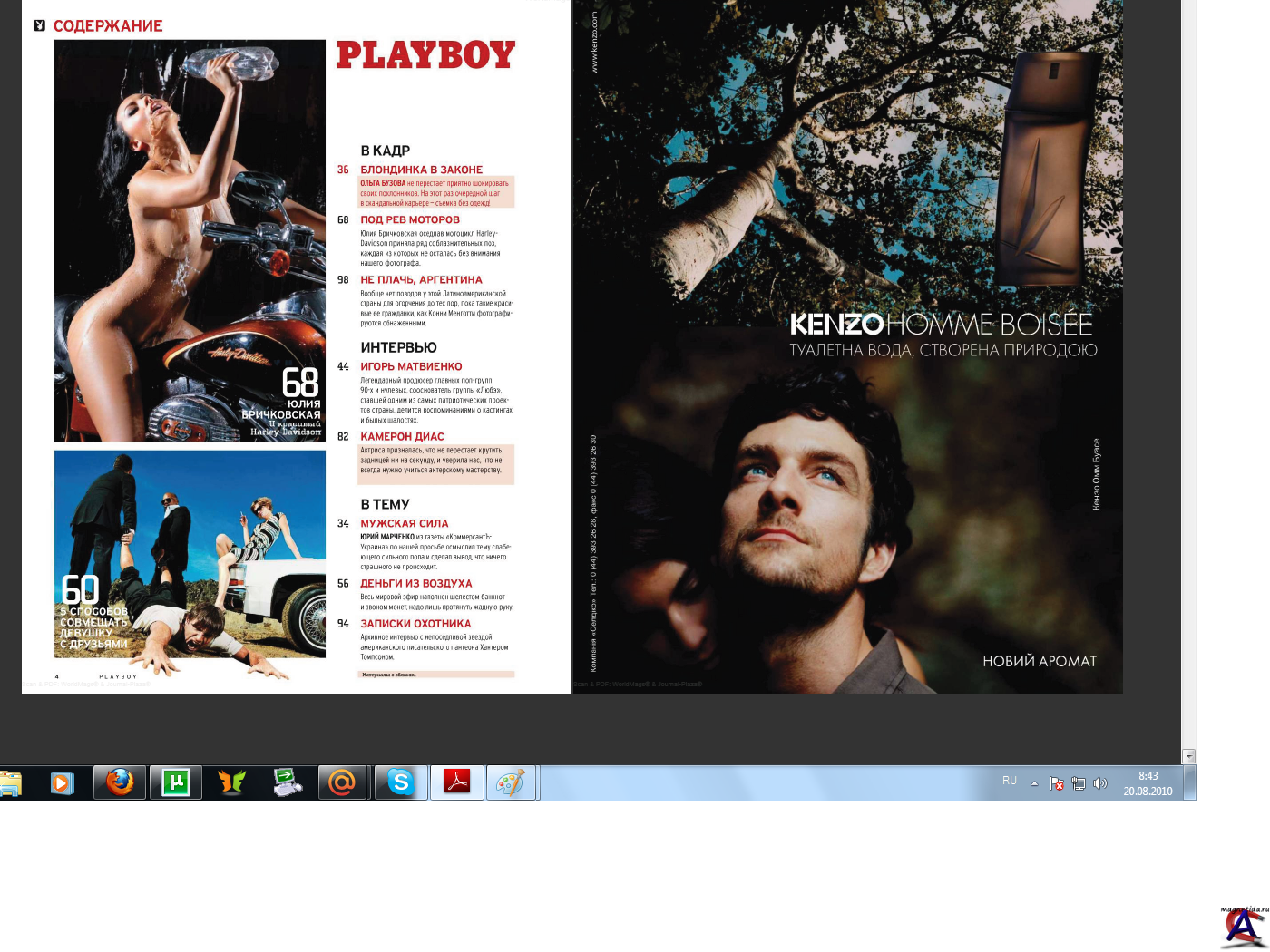Название: Playboy №9 Украина сентябрь 2010 Издательство: ЗАО «Издательский дом «Бурда» по лицензии Playboy Enterprises Главный редактор: Влад Иваненко Жанр: Журнал Формат: PDF Количество страниц: 130 Язык: Русский Описание: Playboy (Плейбой) — имя, ставшее легендой. Популярнейший во всем мире глянцевый мужской журнал появился в России в 1995 году и очень быстро стал самым востребованным изданием в своей категории. Playboy охватывает очень широкий тематический спектр: самые красивые женщины мира, эффектные пикториалы и эксклюзивные съемки знаменитостей, яркие фоторепортажи со светских раутов, впечатляющие рассказы о путешествиях, престижные автомобили, мужская мода и стиль жизни. Интеллектуальная проза, интервью с известными мужчинами — о бизнесе, увлечениях и отношении к жизни. Получать удовольствие, уметь находить во всем приятные стороны — эти жизненные ценности актуальны для мужчин во все времена. Журнал Playboy — это стильные фото и публикации о модной литературе, музыке, кино, спорте, аудиовидеоновинках, сексе, отношениях, карьере. В каждом номере — девушка месяца и галерея Playboy. Playboy — классический мужской life style журнал!