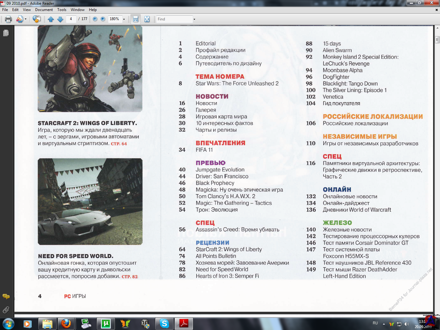 Описание: Полная электронная версия журнала PC ИГРЫ – правильного журнала о компьютерных играх, который предоставляет читателю оперативную, исчерпывающую, подробную и эксклюзивную информацию о компьютерных играх, о событиях и тенденциях в игровой индустрии, и, конечно же, все о новинках в области компьютерных технологий, необходимых для игр; это самый объемный журнал с богатейшей комплектацией. Максимум необходимой активным геймерам информации – это «РС ИГРЫ»! Анонс журнала Star Wars: The Force Unleashed 2. Добить Дарта Вейдера (Тема номера) На сиквел мы взглянули в Лондоне – там, в гостинице у Трафальгарской площади, собрались разработчики, которые привезли с собой не только слайды и картинки, но и рабочую версию игры. Но для начала – черт с ней, с рабочей версией – давайте смотреть на сюжет. Чтобы завороты истории лучше воспринимались, разработчики отводят нас в миниатюрный кинозал – здесь и начинается презентация. В голове одна мысль: как же они собираются самих себя переплюнуть? В первой части мы и с Вейдером дрались, и принцессу Лею спасали, и вообще положили начало движению повстанцев – куда уж эпичней? Четкого ответа пока нет – неизвестно даже, не чьей стороне Старкиллер (также известный как Гален Марек) будет сражаться. Впрочем, как и всегда. Assassin"s Creed. Прошлое и будущее сериала (Спец) Давайте начнем с числа 8000000. Восемь миллионов копий – это как минимум. И только у первой игры, у второй еще столько же. Два выпуска Assassin"s Creed по суммарным продажам почти обходят GTA IV – а ведь первая часть получала во многих журналах семерки! Чтобы объяснить такие результаты, достаточно взглянуть на команду разработчиков. Патрис Десиле и его команда знакомы нам по «Пескам времени» (The Sands of Time) – безусловно, лучшей трехмерной игре про принца Персии и вообще одному из важнейших экшнов нулевых. Не удивительно, что и в наступившем десятилетии команда задает тренды, – только посмотрите, сколько сейчас разработчиков пытаются воровать техники у Альтаира. Даже в каком-нибудь The Saboteur можно карабкаться по домам и прыгать по крышам. С дебюта Assassin"s Creed не прошло и пяти лет, а линейка расцвела в самых разных жанрах и формах: семь игр, комиксы, книга, короткометражный фильм, фигурки, отличные саундтреки и гениальные артбуки – Ubisoft делает деньги, но обижаться на них нет никаких сил: этот сериал не собирается нам надоедать. StarCraft 2: Wings of Liberty. Второе пришествие (Обзор в двух частях) Для отъявленных любителей стратегий ожидание выхода StarCraft 2 давным-давно стало неотъемлемой частью жизни. Проснулся, почистил зубы, пождал немного выхода StarCraft 2, сходил на учебу или на работу, еще чуть-чуть подождал StarCraft 2 там, вернулся домой, по дороге ждал StarCraft 2 и листал газету, поужинал, завалился спать и засыпая, подумал: когда же она, черт ее дери, выйдет? Невозможно же. А теперь этот lifestyle’овый кусок взяли и оттяпали: StarCraft 2 наконец-то заполонила все магазинные полки, словно стая зубастых зергов. Второй сезон звездного сериала про космических тараканов и их друзей вышел «в люди» как раз тогда, когда сражаться за поголовье стратегоадептов, в сущности, не с кем: конкуренты либо передохли, либо мутировали, и остался StarCraft 2 единственным на всю округу представителем полузабытого вида «классическая стратегия в реальном времени», где нужно строить базу, разрабатывать апгрейды для войск, вырезать поголов