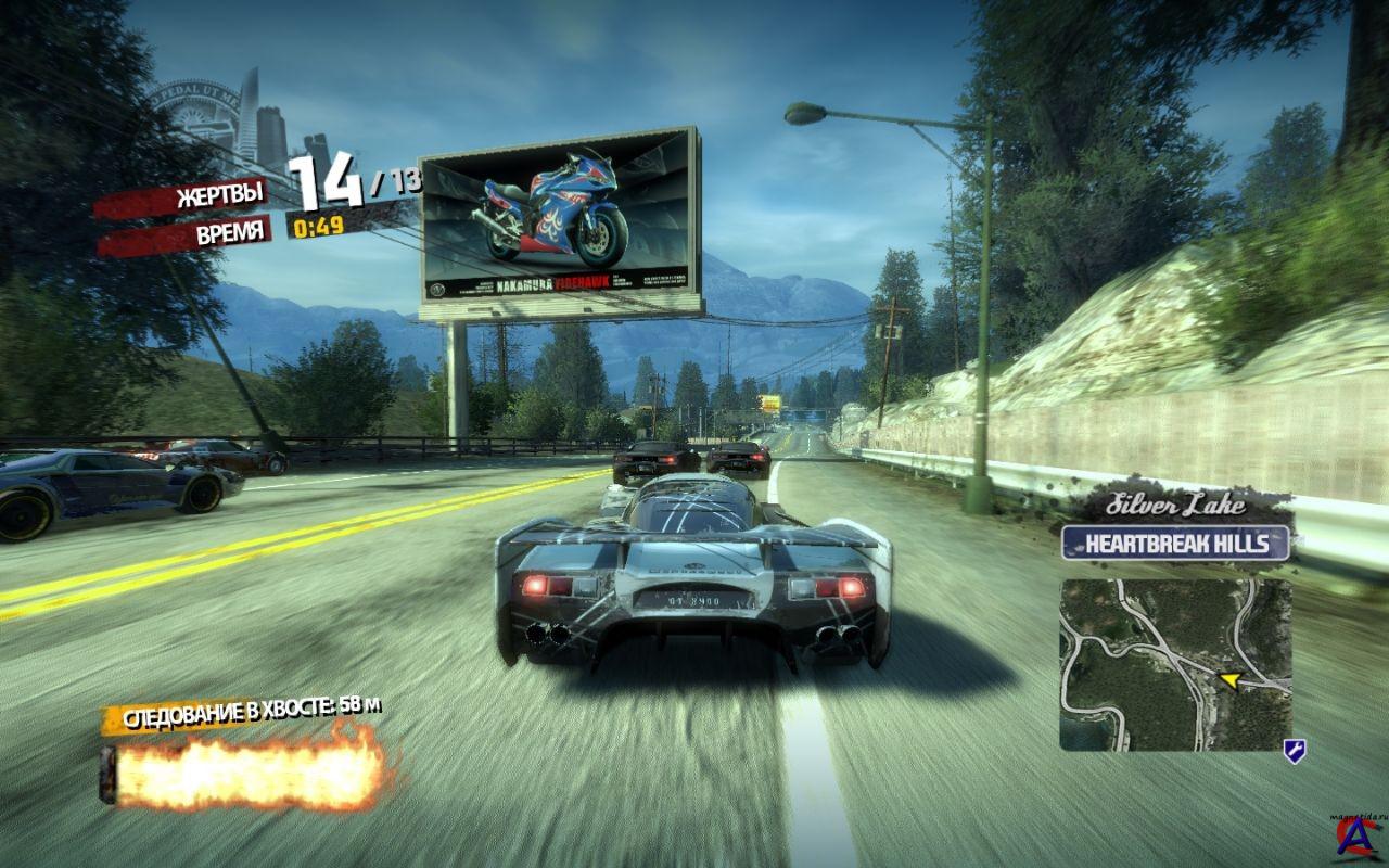 Жанры:Racing (Cars) / Arcade / 3D Разработчик: Criterion Games Издатель: Electronic Arts Колличество дисков: 1 DVD Статус: в продаже с 5 февраля 2009 г. Российский статус: в продаже с 11 февраля 2009 года Язык: Русский, Английский, Немецкий, Испанский, Французкий, Итальянский, Польский, Норвежский. Системные требования: * Операционная система: Windows XP/Vista * Процессор: Pentium IV 2.8 GHz * Память: 1024 MB * Видео: 128 MB NVIDIA GeForce 6600, ATI Radeon 9800 c поддержкой пиксельных шейдеров 3.0 * Звук: DirectX совместимый с 9.0C * HDD: 4.2 GB * DirectX 9.0C Описание игры: Добро пожаловать в Парадайз-Сити — райское местечко для автоманьяков и безумных гонщиков. Огромный город с сотнями улиц и десятками скоростных трасс, столица сверкающих небоскребов, заполненная ничего не подозревающими автомобилистами — вот где пройдут новые соревнования Burnout Только те, кто готов уничтожать соперников ради забавы, достойны участвовать в них. Приготовьтесь излить всю свою ярость и разнести мегаполис на мелкие кусочки. Докажите, что тотальное разрушение — ваша стихия Особенности игры: * Полная свобода действий Отныне перед вами целый город с небоскребами, мостами, красивейшим побережьем и гористой местностью неподалеку. Свобода передвижения ничем не ограничена Вы сами ищете места проведения очередных гонок или бесцельно катаетесь по улицам в свое удовольствие. * Чудеса на виражах В Paradise City вас ждет целый набор увлекательных мини-игр. Самая долгая езда по встречной без лобового столкновения, самый продолжительный занос, лихая парковка между двумя близко стоящими машинами — здесь некогда скучать * Сотни машин Каждый участник движения может стать частью грандиозного ДТП Устраивайте самые масштабные и эффектные аварии за всю историю серии, используйте свою фантазию, и победа окажется на вашей стороне * Безумные соперники Кроме вас по дорогам Paradise City колесят еще тридцать четыре автоманьяка. Каждый из них владеет уникальными приемами и техникой езды. Будьте осторожны: соперники постараются покончить с вами при первой же возможности Установка игры: 1. Монтируем образ в Daemon Tools 2. Устанавливаем игру используя текстовый файл с ключиком из папки Crack 3. Устанавливаем обновление 1001 включен в папку Crack 4. Копируем ЕХЕ-файл из папки Crack в папку с игрой заменяя оригинальный ЕХЕ-файл 4. Играем.