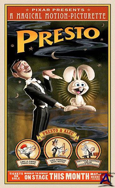 Качество: DVDRip Перевод: Не требуется Аудиокодек: AAC 48000Hz stereo 80Kbps Видеокодек: MPEG4 Video (H264) 720x480 Продолжительность: 05:17 Режиссер: Даг Свитленд / Doug Sweetland Описание: Дебют Дага Свитленда — штатного пиксаровца, работавшего на всех больших проектах студии — расскажет о фокуснике по имени Престо ДиДжитаджиони и его трюке с шляпой. Публика носит Престо на руках, не обращая внимания на кролика Алека, которого он так эффектно вынимает из цилиндра на глазах у изумленной толпы. И вот однажды факир отправился на ужин, оставив Алека за кулисами в клетке и забыв дать ему морковку…