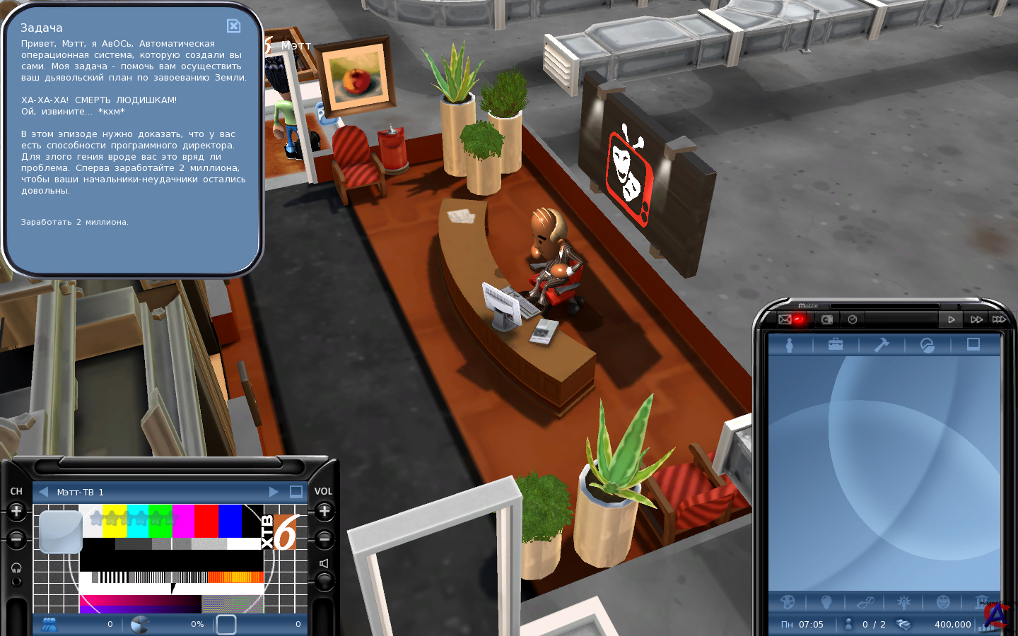 Год выпуска: 2010 Жанр: Strategy (Manage/Busin.) / 3D / Isometric Разработчик: Realmforge Studios Издательство: 1C-СофтКлаб Тип издания: лицензия Язык интерфейса: Русский Язык озвучки: Русский Таблэтка: Не требуется Системные требования: Операционная система: XP / Vista / Windows 7 Процессор: с тактовой частотой 2,0 ГГц Оперативная память: 1 Гб оперативной памяти или больше Видеокарта: со 128 Мб видеопамяти, совместимая с DirectX 9.0c, с поддержкой пиксельных шейдеров версии 3,0 Звуковая карта: DirectX 9.0c compatible sound card Свободное место на жестком диске: 2 GB Описание: Вас приветствует компания *МУТь-ТВ - МегаУбойное Трэш-Телевидение*! Попробуйте себя в роли начинающего телемагната, стремящегося к власти над всем миром. Выиграйте в напряженной борьбе за сердца и умы телезрителей. Нанимайте сценаристов, покупайте концепции, приглашайте лучших актеров - лишь бы денег хватило! Налаживайте отношения с эксцентричными режиссерами, распределяйте эфирное время так, чтобы завоевать симпатии аудитории, - всё это поможет выполнить условия крупных рекламных контрактов. Однако для победы одного таланта мало: порой обойти конкурентов можно лишь с помощью небольшой диверсии... Играть честно или нет - выбор за вами. Особенности: # Пусть соперники позеленеют от зависти, наблюдая за развитием вашей телевизионной империи! Дирекция, отделы сценаристов и производства, студия звукозаписи, фильмотека, редакция новостей — эти и другие подразделения необходимы, чтобы добиться высокого качества программ, а значит и популярности. # Встроенный редактор — прекрасная возможность укомплектовать штат компании, создавая сценаристов, режиссеров и актеров с уникальными характерами и внешностью. Приглашайте на работу лучших из лучших — ну, или тех, кого можете себе позволить. # Приобретайте готовые шоу, сериалы и фильмы или выпускайте собственные, умело сочетая лучшие концепции и сценарии, подбирая режиссеров и актеров. # Добейтесь признания у восьми целевых групп зрителей, каждая из которых имеет уникальные предпочтения, — это увеличит рыночную стоимость компании и позволит заполучить самые выгодные рекламные контракты. # Захватывающая конкурентная борьба: до семи соперников — виртуальных или же реальных — в игре по сети. Кроме того, управлять телекомпанией можно вместе с другом в режиме совместной игры. # Постигайте тонкости успешного управления телеканалом в обучающем режиме. Пройдите все эпизоды кампании либо наслаждайтесь свободной игрой.