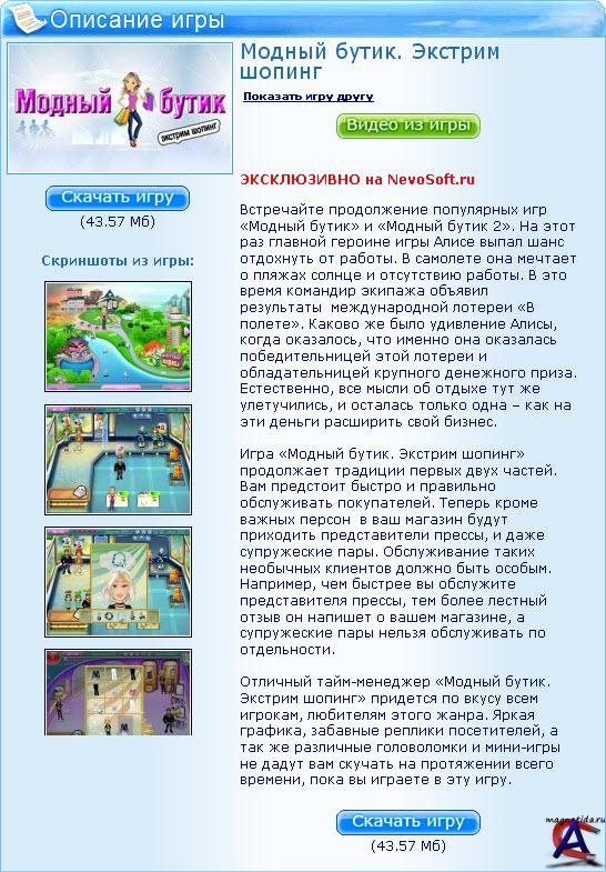 Игра в архиве, по времени не ограничена. Встречайте продолжение популярных игр «Модный бутик» и «Модный бутик 2». На этот раз главной героине игры Алисе выпал шанс отдохнуть от работы. В самолете она мечтает о пляжах солнце и отсутствию работы. В это время командир экипажа объявил результаты международной лотереи «В полете». Каково же было удивление Алисы, когда оказалось, что именно она оказалась победительницей этой лотереи и обладательницей крупного денежного приза. Естественно, все мысли об отдыхе тут же улетучились, и осталась только одна – как на эти деньги расширить свой бизнес. Игра «Модный бутик. Экстрим шопинг» продолжает традиции первых двух частей. Вам предстоит быстро и правильно обслуживать покупателей. Теперь кроме важных персон в ваш магазин будут приходить представители прессы, и даже супружеские пары. Обслуживание таких необычных клиентов должно быть особым. Например, чем быстрее вы обслужите представителя прессы, тем более лестный отзыв он напишет о вашем магазине, а супружеские пары нельзя обслуживать по отдельности. Отличный тайм-менеджер «Модный бутик. Экстрим шопинг» придется по вкусу всем игрокам, любителям этого жанра. Яркая графика, забавные реплики посетителей, а так же различные головоломки и мини-игры не дадут вам скучать на протяжении всего времени, пока вы играете в эту игру.