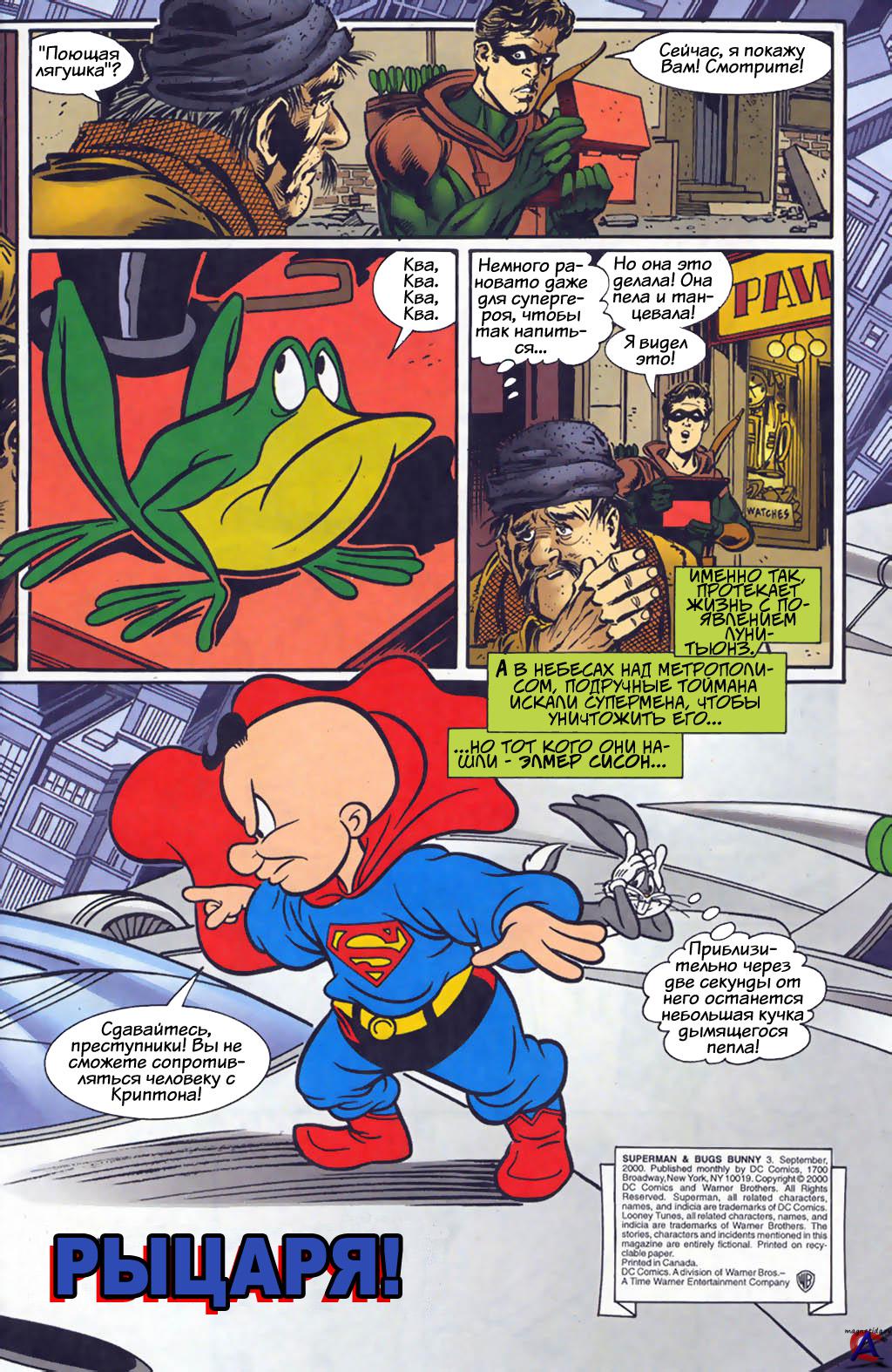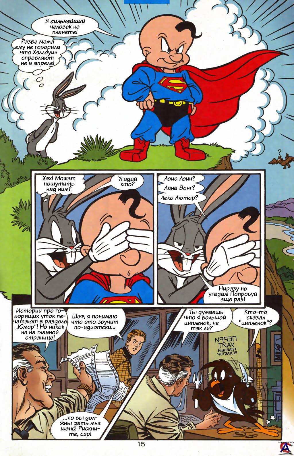 Жанр: Юмор, Фантастика Авторы: Марк Эванер и Джо Стетон Язык: Русский Формат: cbr Обьем: 4 номера Описание: Никогда не хотели узнать что будет если в одном комиксе будут фигурировать не только супергерои, ни и комичные мультяшки? Могли ли вы представить, что Бетмена заменит утка Даффи? А вот сценарист Марк Эванер и художник Джо Стетон представили, и вышло довольно неплохо Комикс сочетает в себе хороший рисунок, имеет интересный сюжет который естественно граничит с уничтожением всего мира, и старые «добрые» шутки от Луни Тьюнз. То есть можно сказать. Что для американцев создатели просто объединили две самые важные вселенные в мульт индустрии. Ну а фанаты издательства DC, могу увидеть своих кумиров, и особенно Супермена созданного Джо Шустером и Джери Сигелом, совершенно в новых и порой даже безумных положениях.