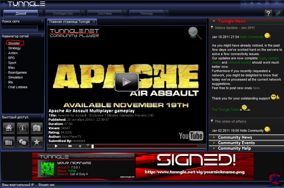 Версия: 4.3.2.0 Активация: Регистрация на сайте (бесплатно) Язык интерфейса: Русский Описание: Tunngle является революционным VPN решением, это программа-клиент, которая помогает игрокам, находясь в ней, играть в разные игры по виртуальной локальной сети через интернет. Tunngle имитирует соединение разных компьютеров в одну виртуальную (псевдолокальную) сеть для совместной игры. Сеть распространяется только на игры. Ещё одна особенность, поскольку это локальная сеть – хостить может любой. Tunngle лучше чем Hamachi? Намного лучше! Tunngle не требует каких либо хитро-мудрых настроек. Программа построена так что можно легко найти других игроков. То есть в Tunngle существуют комнаты с названиями игр (на подобию Garena). Люди которые хотят сыграть например, в COD4, будут заходить в комнату COD4 для того чтобы найти "нужных игроков". В программе даже есть комнаты которые поддерживают C-Class emu. Это может пригодится для некоторых игр (Counter-strike 1.6, Half-life 1 и т.д.). Регистрация: После установки программы запускаем клиент и снизу жмём ЗАРЕГИСТРИРОВАТЬСЯ, после чего переходим на сайт и вводим свои данные. Готова. P.S. клиент может зависать на отметке ЗАВЕРШЕНИЕ... просто нажмите отмена и всё впорядке.