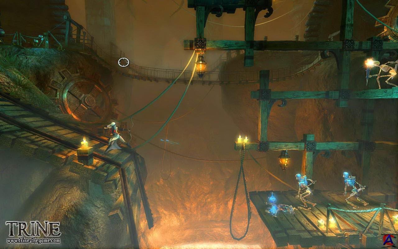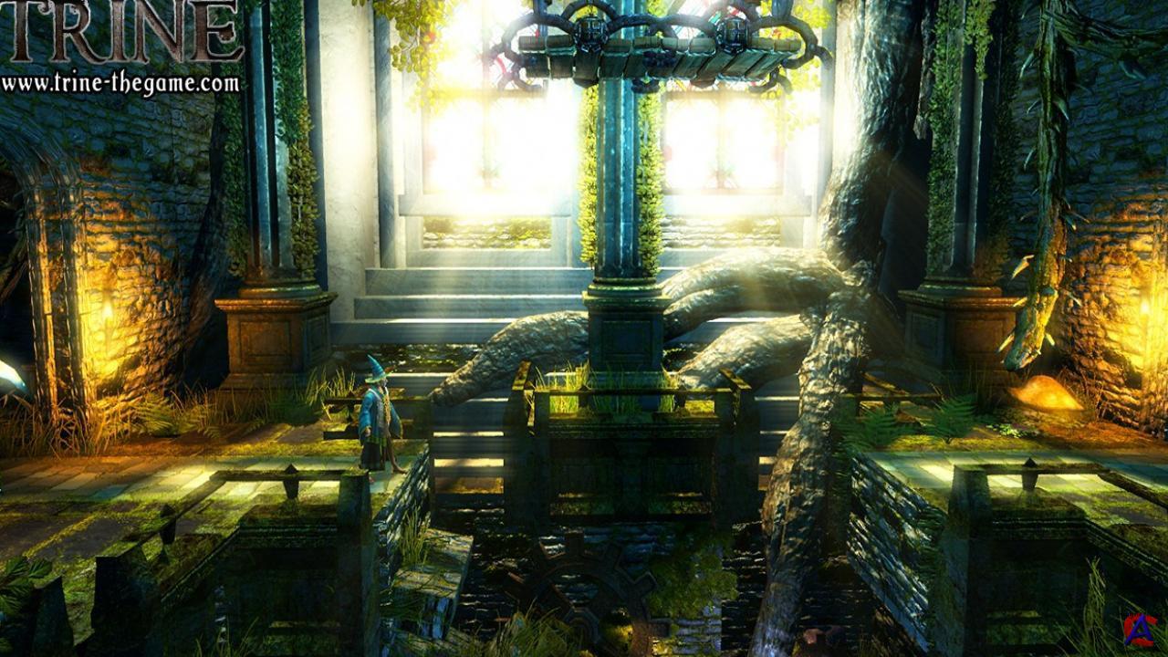 Системные требования: Рекомендуемые: * Processor: Dual-Core CPU or better * Operating System: Windows XP / Windows Vista * System Memory: 2 GB * Hard-Disk Space: 1 GB * Sound Card: DirectX compatible soundcard * Video Card: Radeon HD 3800 series or GeForce 8800 series or better * Other: gamepad(s) for co-op play Описание: Trine перенесет вас в фэнтезийный мир, где храброму рыцарю Понтию, изумительному магу Амадею и загадочной воровке Зое предстоит спасти мир от сил зла. Но сделать это не так то и просто, ведь они связаны невидимыми нитями с мистическим предметом Trine. У каждого из персонажей присутствуют уникальные способности и тактики, которые помогают им сражаться с армией мертвецов и хитроумных изобретений. А игроку дана возможность в любой момент переключаться между персонажами, чтобы без проблем разрешать встающие на пути загадки. Trine прежде всего цепляет не самой типичной для платформеров вещью: очень красивой картинкой. Здешнюю графику трудно описать словами – она, как бы вам сказать, очень мягкая: плавная анимация всех персонажей и гадских гадов, безумно красивые и безупречно детализированные уровни и общая пестрая (но не вульгарная) цветовая гамма в сумме заставляют вас то и дело отвлекаться от процесса кромсания оппонентов в овощи и, облизываясь, разглядывать панорамы, щелкая по кнопке снятия скриншотов. Ваш обозреватель то и дело сокрушался, что игра, несмотря на всю ее трехмерность, вопиюще плоская: массивные механизмы, работающие за плечом героя, и вкусные элементы интерьеров не удастся пощупать: дизайнеры Frozenbyte корпели над ними только лишь для того, чтобы они проносились по экрану вашего монитора со скоростью поезда «Красная стрела». В Trine главной изюминкой обещаются фокусы с физической системой Ageia PhysX. До тех пор, пока вы будете играть за воина и воровку, никаких технологических новшеств вы не углядите: громила-войн Понтиус, увешанный тяжелой броней, только и делает, что режет скелетов на части своим мечом и укрывается щитом от особенно наглых вражеских атак, падающего мусора и летящих в него файерболлов, в то время как воровка по имени Зоя поражает гадов на расстоянии выстрелами из лука и передвигается по уровням скачками, цепляясь за выступы и балки при помощи крюка-«кошки». Однако все это не идет ни в какое сравнение с тем, что умеет вытворять здешний волшебник в смешной широкополой шляпе по имени Амадеус. Умелец двигает предметы на расстоянии покруче Ури Геллера и вызывает из воздуха огромные ящики, тяжелым грузом падающие на головы несчастным противникам. К счастью, фантазия авторов не ограничивается предоставлением вам возможности строить пирамиды из подручных предметов – время от времени вас попросят то собрать мост из деревяшек, то силой волшебничьей воли подтащить к деревянной двери массивный чугунный таран, который разнесет препятствие в щепки. UPD: Заменил на версию от Руссобит-М