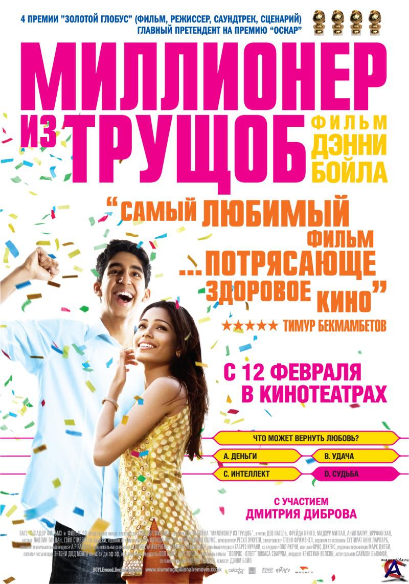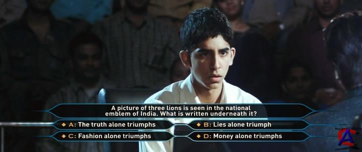 Качество: DVDrip Видео кодек: Xvid 720x304 23.98fps Аудио кодек: Dolby AC3 48000Hz 6ch 384kbps Перевод: дубляж Качество: DVDrip Видео кодек: Xvid 704x288 25.00fps Аудио кодек: Dolby AC3 48000Hz 6ch 448kbps Перевод: дубляж Жанр: драма, мелодрама, Рейтинг mpaa: R - Лицам до 17 лет обязательно присутствие взрослого Продолжительность: 120 мин. Информация о фильме: Джамал Малик, 18-летний сирота из трущоб в Мумбаи, всего в одном шаге от победы в телеигре «Кто хочет стать миллионером?» и выигрыша 20 миллионов рупий. Прервав игру, его арестовывает полиция по подозрению в мошенничестве. Откуда юнец, выросший на улице, может знать так много?На допросе в полиции Джамал рассказывает печальную историю своей жизни: о пережитых приключениях вместе с братом, о стычках с местными бандами, о своей трагической любви. Каждая глава личной истории удивительным образом дала ему ответы на вопросы телевикторины.Когда игру возобновят, инспектору полиции и шестидесяти миллионам зрителей захочется выяснить ответ только на один вопрос: зачем этот юноша, без явного стремления к богатству, решил принять участие в телепрограмме?