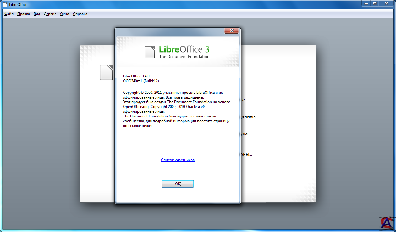 Версия программы: 3.4.0 Final Адрес официального сайта: ru.libreoffice.org Язык интерфейса: Multi/Rus Лечение: не требуется Системные требования: Microsoft Windows 2000 (Service Pack 4 или выше), XP, Vista или Windows 7; 256 Мб ОЗУ (512 Мб ОЗУ); До 1,5 Гб свободного пространства на жестком диске; Разрешение экрана 1024x768 (высокое разрешение рекомендуется), по крайней мере 256 цветов. Описание: OpenOffice представляет собой достаточно мощный офисный пакет, распространяемый на основе открытых исходных кодов. Вполне способен стать достойной заменой офисному пакеты от Microsoft. Хочется заметить, что программа уже довольно таки твердо стоит на ногах и действительно составляет хоть и не особо ощутимую, но все же конкуренцию офису от MS. Об этом факте говорят сами пользователи все чаще и чаще обращающие внимание на этот весьма достойный продукт.
