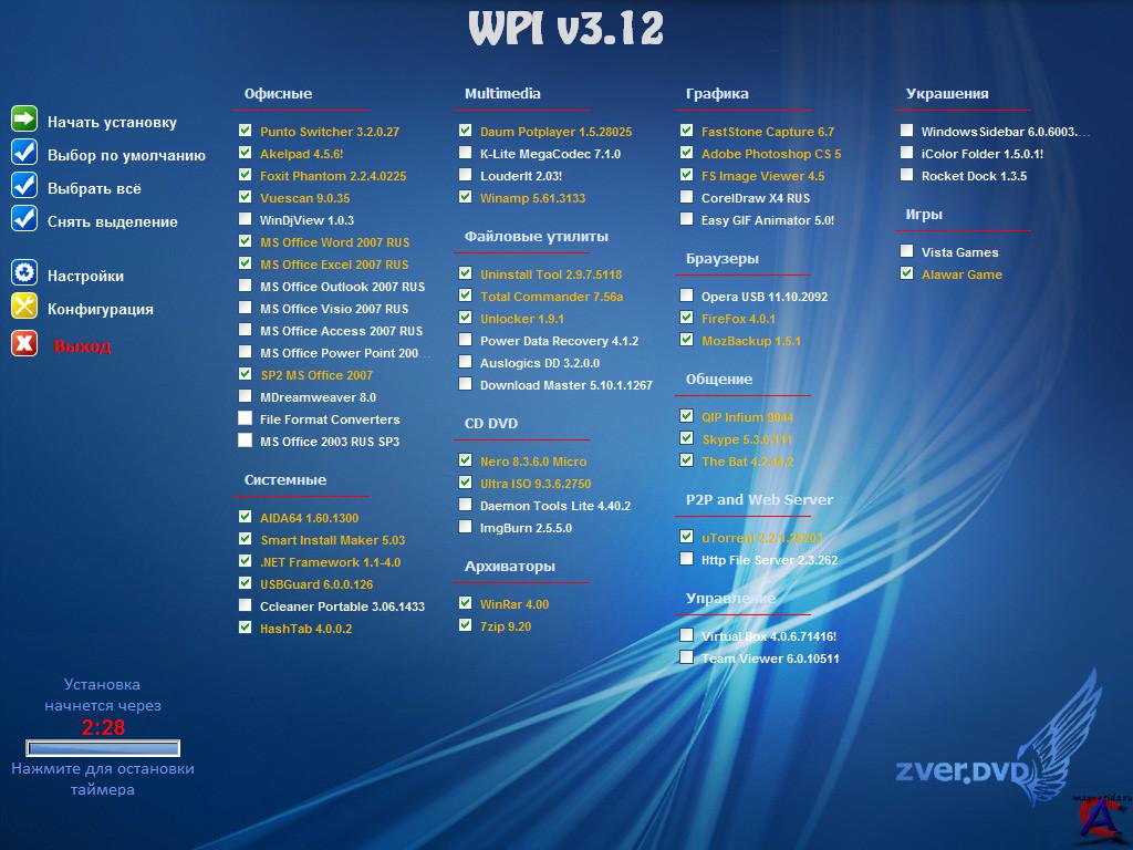 Список изменений в WPI 3.12 - Интегрирован в составе ZverDVD 2011.5 - Удален Intro - Обновлены программы до последних версий на момент выхода сборки - Исправлены ошибки которые были найдены - Улучшена совместимость программ с Windows 7 - Программы которые не устанавливаются на Windows 7 помечены в описании восклицательным ! знаком