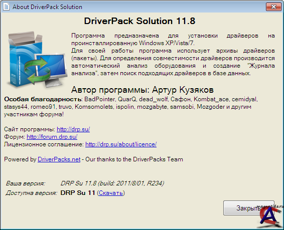 Версия: DriverPack Solution 11.8 (01.08.2011) Язык интерфейса: Мультиязычный (русский присутствует) Системные требования: Windows XP,Vista,7 (32/64-bit) Описание: DriverPack Solution — это самая популярная российская программа для автоматической установки драйверов. DriverPack Solution существенно облегчает процесс переустановки Windows практически на любом компьютере. Теперь вы будете, избавлены от проблем поиска и установки драйверов, сводя их к нескольким кликам! Что нового в DriverPack Solution 11.8? (01.08.2011) Свежие базы Новый движок установки драйверов Функция установки дополнительных программ Улучшенный алгоритм определения температуры процессора Создание контрольных точек восстановления, как при установке драйверов, так и программ Система определения установленного антивируса Список драйверов содержащихся в программе доступен в "Каталоге драйверов" на сайте: drp.su/drivers/10/?ru Преимущества DriverPack Solution 1. Быстрая установка драйверов к Windows DriverPack Solution - самая популярная программа для автоматической установки драйверов. У DriverPack Solution уже более 1 000 000 постоянных пользователей по всему миру. 2. Любые драйвера для любых компьютеров в одной программе DriverPack Solution существенно облегчает процесс переустановки Windows практически на любом компьютере. Теперь Вы будете избавлены от проблем поиска и установки драйверов, сводя их к нескольким кликам! 3. Распространяется свободно DriverPack Solution распространяется по свободной лицензии GNU GPL и с открытым кодом. А это значит, что программу может дорабатывать каждый, тем самым делая её ещё лучше! Добавил DRP12, atlant_is