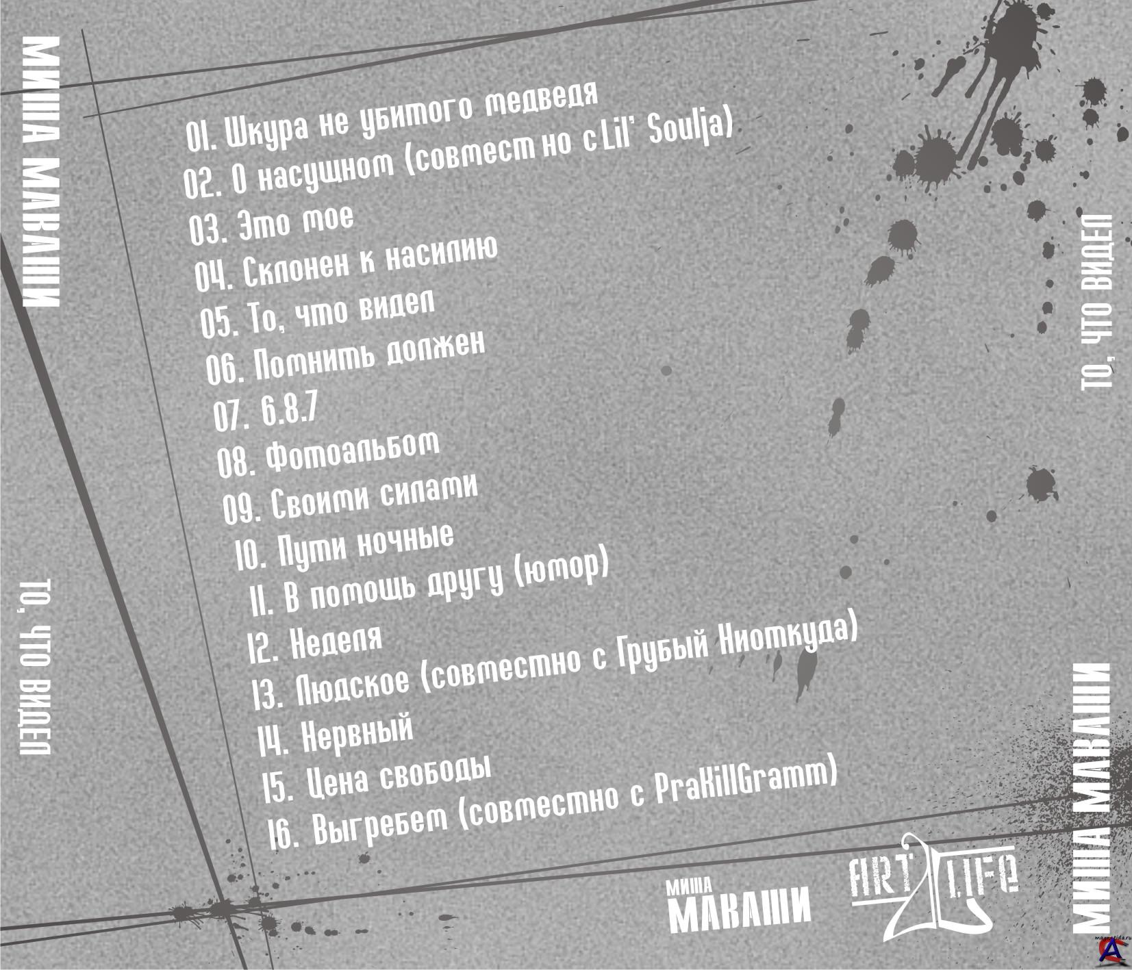 Исполнитель: Миша Маваши Альбом: То, что видел Жанр: Rap/Hip-Hop Год выпуска диска: 2011 Битрейт аудио: 320 kbps Размер: 129 MB При участии: Lil Soulja, Грубый Ниоткуда Треклист: 1) Шкура не убитого медведя 2) О насущном feat Lil Soulja 3) Это мое 4) Склонен к насилию 5) То, что видел 6) Помнить должен 7) 6.8.7 8) Фотоальбом 9) Своими силами 10) Пути ночные 11) В помощь другу.(юмор) 12) Неделя 13) Людское feat Грубый Ниоткуда 14) Нервный 15) Цена свободы 16) Выгребем feat Pra(KillaGramm)