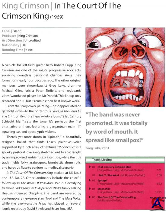 King Crimson, выпущенный в 1969 году. Этот альбом оказал важное и необычно сильное влияние на развитие психоделического рока, прогрессивного рока и тяжёлого металла. Альбом записан с исключительной музыкальностью, поэтикой текстов. В то время как одна часть рок-групп (например, Pink Floyd) была склонна к сочинению длинных композиций, а другая часть пыталась вместить в рок-песню свободу джазовый формы (Фрэнк Заппа), в