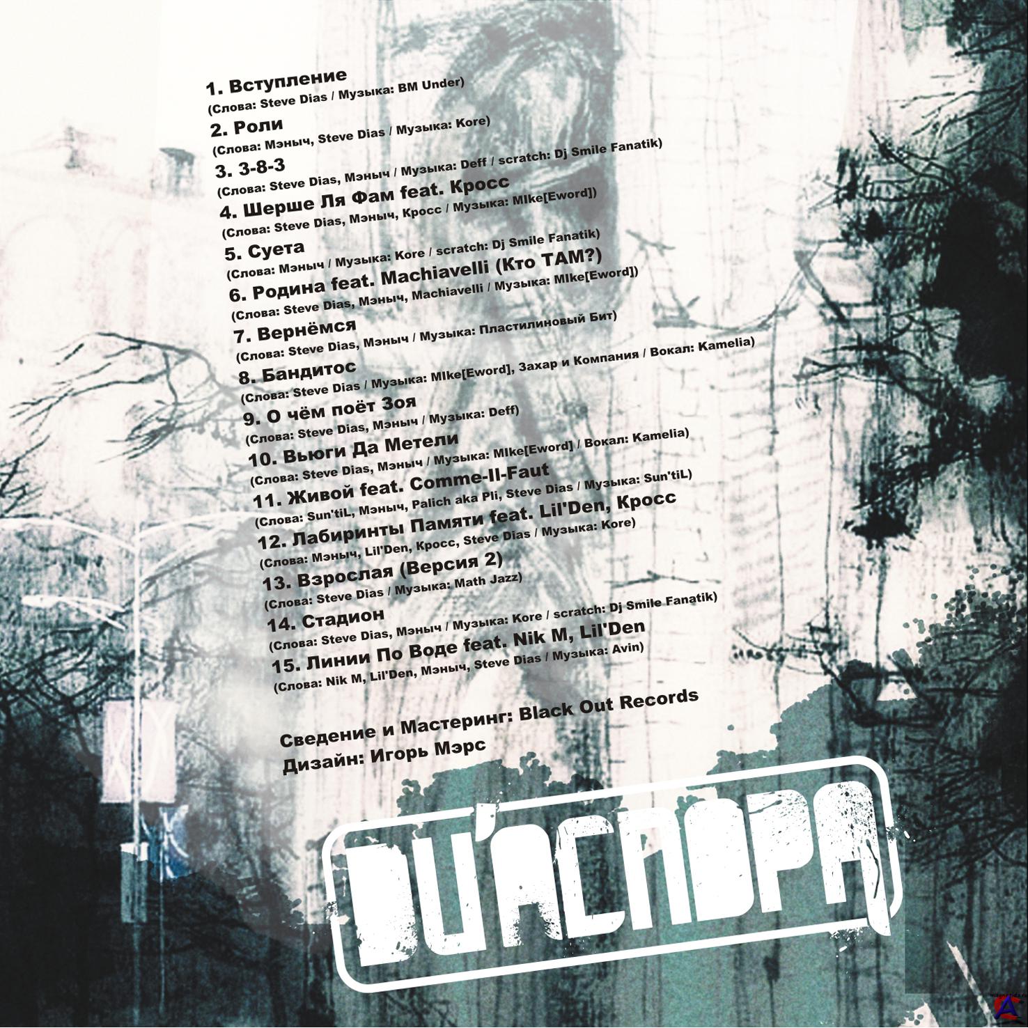 Стиль: Рэп и Хип-хоп Вышел: 2011 Формат: MP3 (320 кбит/сек) Размер: 118 MB Треклист: 01. Вступление 02. Роли 03. 3-8-3 04. Шерше Ля Фам feat. Кросс 05. Суета 06. Родина feat. Machiavelli (Кто ТАМ) 07. Вернёмся 08. Бандитос 09. О Чём Поёт Зоя 10. Вьюги Да Метели 11. Живой feat. Comme-Il-Faut 12. Лабиринты Памяти feat. Lil"Den, Кросс 13. Взрослая 14. Стадион 15. Линии По Воде feat. Nik M, Lil"Den