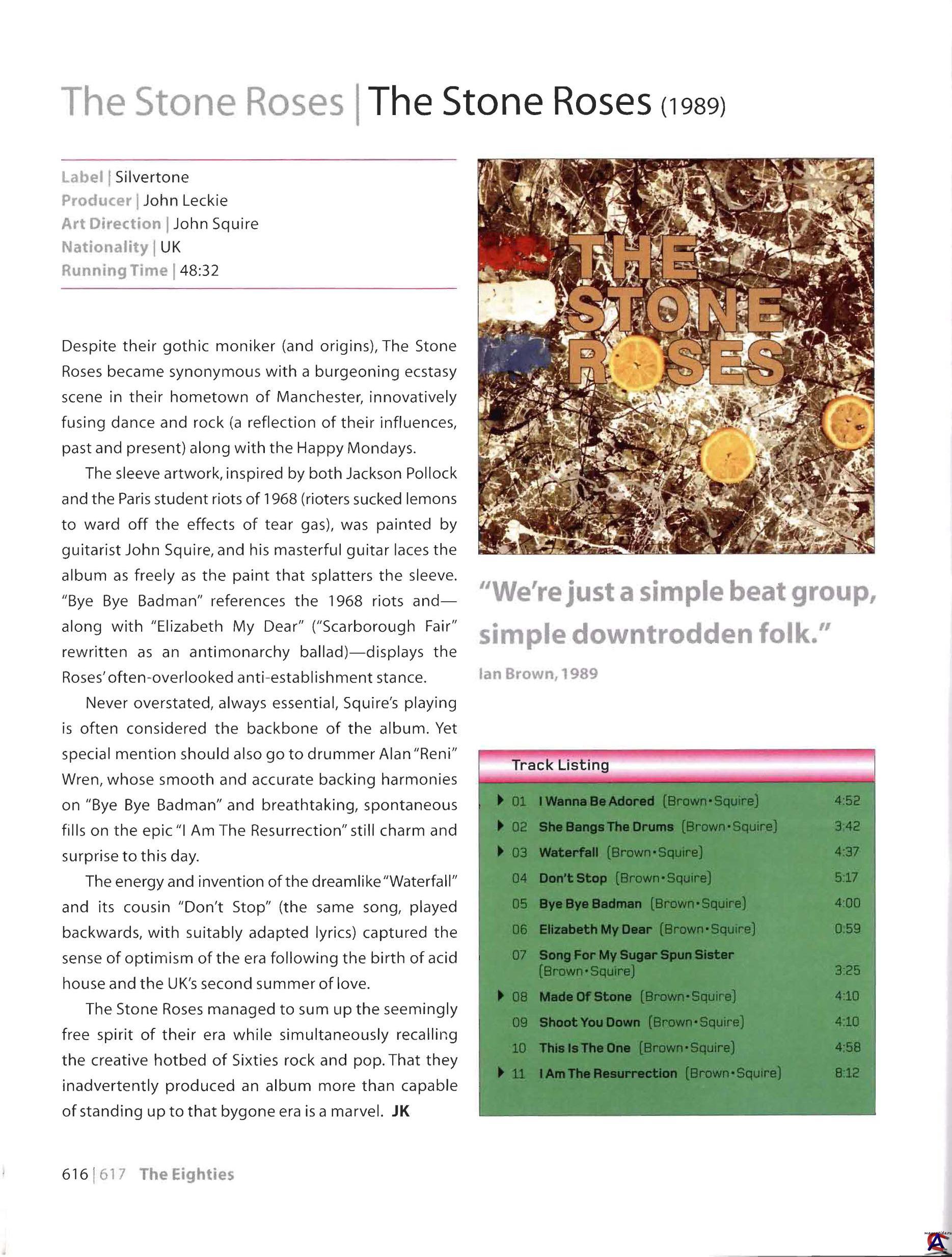 В 1989 The Stone Roses выпускают одноименный дебютный альбом, спродюсированный Джоном Леки (John Leckie). The Stone Roses был выдающимся дебютом. Он открывается «I Wanna Be Adored» и заканчивается «I Am The Resurrection», обе песни воплощают собой несокрушимость и амбициозность молодости. Такое же настроение проходит через весь альбом. Сейчас считающейся вехой в истории английского рока, тогда он был хорошо принят большей частью музыкальной прессы и, благодаря позитивным отзывам, начал приносить популярность группе.