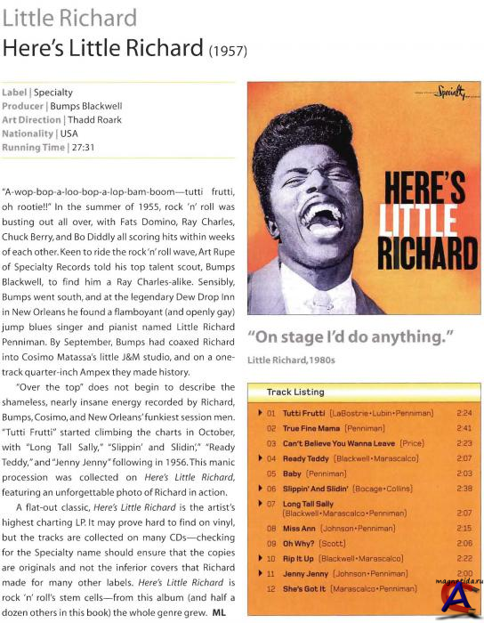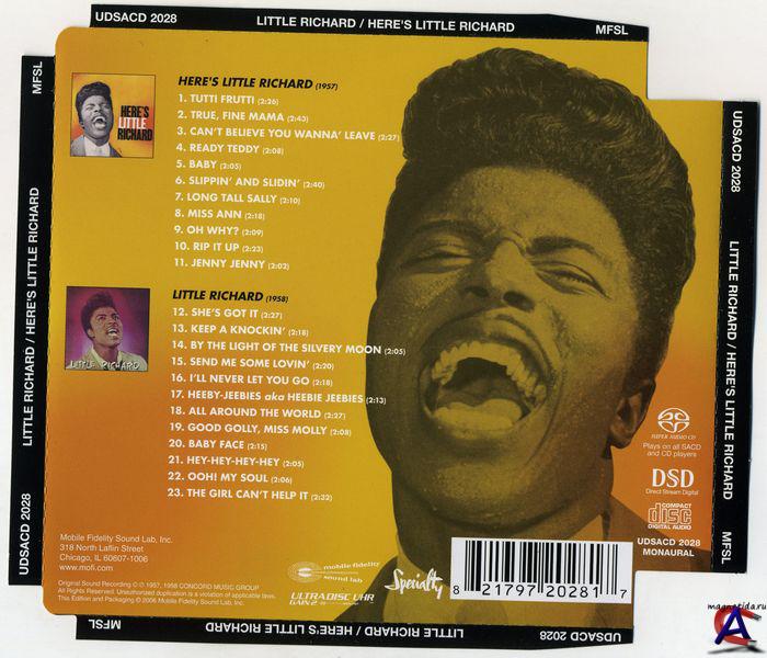 Трэклист Here"s Little Richard 1 Tutti Frutti 2:26 2 True, Fine Mama 2:43 3 Can"t Believe You Wanna" Leave 2:27 4 Ready Teddy 2:08 5 Baby 2:05 6 Slippin" And Slidin" 2:40 7 Long Tall Sally 2:10 8 Miss Ann 2:18 9 Oh Why? 2:09 10 Rip It Up 2:23 11 Jenny Jenny 2:02 Little Richard 12 She"s Got It 2:27 13 Keep A Knockin" 2:18 14 By The Light Of The Silvery Moon 2:05 15 Send Me Some Lovin" 2:20 16 I"ll Never Let You Go 2:18 17 Heeby-Jeebies 2:13 18 All Around The World 2:27 19 Good Golly, Miss Molly 2:08 20 Baby Face 2:15 21 Hey-Hey-Hey-Hey 2:05 22 Ooh! My Soul 2:06 23 The Girl Can"t Help It 2:32 24 Lucille 2:23