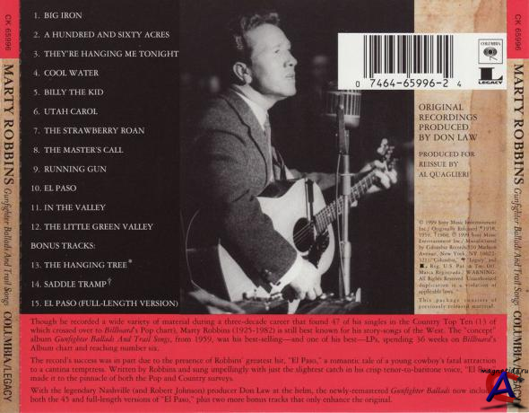 Трэклист 1 Big Iron 3:56 2 A Hundred And Sixty Acres 1:40 3 They"re Hanging Me Tonight 3:05 4 Cool Water 3:09 5 Billy The Kid 2:19 6 Utah Carol 3:13 7 The Strawberry Roan 3:25 8 The Master"s Call 3:05 9 Running Gun 2:10 10 El Paso 4:19 11 In The Valley 1:48 12 The Little Green Valley 2:26 Bonus Tracks 13 The Hanging Tree 2:50 14 Saddle Tramp 2:03 15 El Paso (Full-Length Version) 4:38