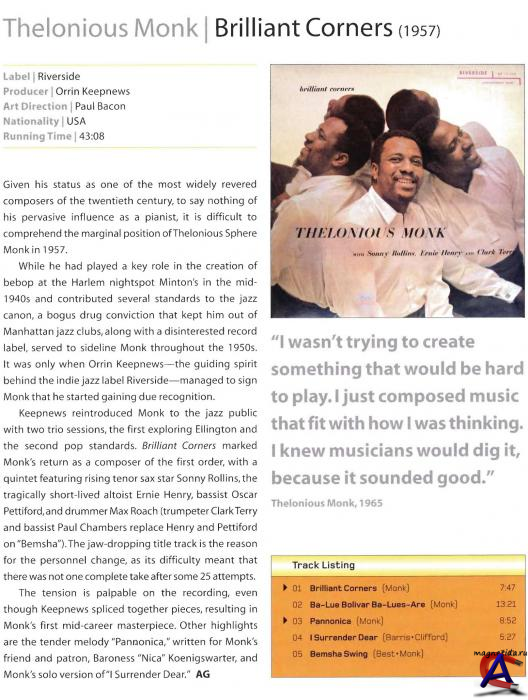 Об исполнителе Телониус Сфир Монк (англ. Thelonious Sphere Monk) — выдающийся джазовый пианист и композитор, наиболее известен как один из родоначальников бибопа. В своём творчестве придерживался оригинального стиля, был авангардистом и примитивистом, его манера игры была не совсем характерна для джаза: его музыка была «рваной», изобиловала большим количеством скачков. Тем не менее, такие его композиции, как «Round Midnight», «Ruby My Dear», «52nd Street Theme» и многие другие стали классикой джаза и позднее исполнялись многими музыкантами. Детство и юность Родился Телониус Монк 10 октября 1917 года; в семье Барбары Монк (в девичестве Бэттс) и Телониуса Монка он был вторым ребёнком (сестру Монка звали Мэрион, она была старше его на два года, младшего брата звали Томас). Сам музыкант в разное время называл разные даты своего рождения, точно это было установлено только в 1968 году, когда критик Леонард Фэзер обнаружил оригинал свидетельства о рождении. В этом документе его имя записано как «Телониус Монк-младший». Второе имя, Сфир, он по видимому присвоил себе в честь деда по материнской линии. В возрасте трёх лет музыкант вместе с семьёй переехал в Нью-Йорк, на Манхэттен. В квартире по адресу 243 West 63rd St, где они поселились, он прожил почти всю оставшуюся жизнь — сначала с матерью, сестрой и братом (отец оставил семью вскоре после переезда и вернулся в Роки Маунт), а затем с женой и детьми. Барбара Монк была вынуждена работать на нескольких работах сразу, чтобы прокормить детей; но помимо финансовых затруднений ничто не усложняло детства мальчика: моральная обстановка в семье была хорошей, в школе он учился хорошо (хотя и имел проблемы в общении со сверстниками), особенно любил физику и математику. Впервые за фортепиано Телониус сел в возрасте 6 лет. Периодически он брал уроки, но академического музыкального образования так и не получил и был невысокого мнения о высшем образовании в целом. Своими кумирами он считал Дюка Эллингтона, Джеймса П.Джонсона и других страйд-пианистов того времени. В 1940 году он получил должность пианиста в легендарном манхэттенском клубе «Minton"s Playhouse». На этой работе Монк зарабатывал всего 17 долларов в неделю, но получал большое удовольствие от импровизаций с барабанщиком Кенни Кларком: они выработали свою собственную манеру игры, усложняя композиции, чтобы отсеивать посредственных исполнителей, желавших выступать с ними вместе. В 1942 году в клубе стали появляться Диззи Гиллеспи и Чарли Паркер, которые позаимствовали систему аккордов и стиль Монка и стали общепризнанными родоначальниками бибопа, обретшего популярность и коммерческую успешность в 1944 году. В том же 44-м Монк покинул «Minton"s Playhouse», не добившись признания широкой публики. Ранние записи (1944—1954) В 1944-м сделал свою первую студийную запись совместно с квартетом Коулмена Хокинса. Хокинс был первым известным музыкантом, поверившим в талант молодого Телониуса Монка, и тот впоследствии отплатил ему за доверие приглашением поучаствовать в записях 1957 года с Джоном Колтрейном. В 1947 году произошло два очень важных для Монка события. Наступил переломный момент в его карьере: в августе он подписал контракт на пять лет со студией звукозаписи «Blue Note» и сделал первую самостоятельную студийную запись. Произошли изменения и в его личной жизни: в этом году он вступил в брак с Нелли Смит, которую знал 