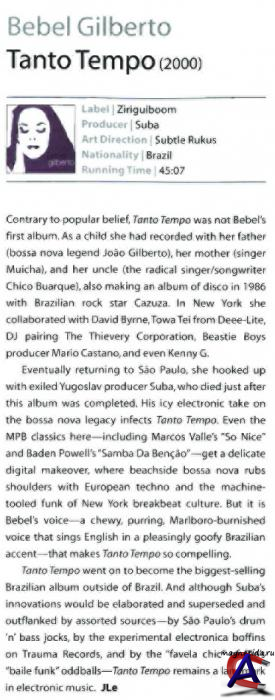Об исполнителе Детство и юность Бебель Жилберту прошли в Рио-де-Жанейро, Бразилия. Она начала заниматься пением с подачи матери и в возрасте семи лет записала пару песен для её первого сольного альбома «Miucha». В девять Бебель уже участвует вместе с Miucha и саксофонистом Stan Getz в джазовом фестивале в Нью-Йорке, в Карнеги-холл. Через некоторое время она осваивает театральные подмостки: выступает в популярных мюзиклах «Os Saltimbancos» (и участвует в записи саундтрека для него) и «Pirlimpimpim». Позже Бебель поступила в экспериментальную театральную труппу, дающую представления с цирком Circo Voador (Летающий цирк) в Ipanema Beach. Там она познакомилась и подружилась с певцом и композитором Cazuza, ставшим в 1980-е одной из самых известных рок-звёзд Бразилии. В это время Жилберту начала писать песни в соавторстве с Cazuza и Dй. Одна из их песен — «Preciso Dizer Que Te Amo» — стала национальным хитом и получила несколько музыкальных наград, в том числе звание лучшего сингла года по версии Brazilian Sharp Award. Вместе с соотечественником, певцом Pedrinho Rodrigues, в 1983 году Изабель участвует в создании альбома «Un Certo Geraldo Pereira». А через три года она записала на Warner Music свой первый миньон, который включал знаменитые песни «Preciso Dizer Que Te Amo» и «Mais Feliz». В 1991 году Бебель переехала в Нью-Йорк, где приняла участие в проходившем в Бруклинской академии музыки шоу-трибьют бразильской звезде Кармен Миранде, с участием Laurie Anderson и Nanб Vasconcelos. В США, создав свою собственную группу, Жилберту стала осваивать нью-йоркскую сцену, выступая в престижных клубах и концертных залах, включая Линкольн-центр. На протяжении девяностых годов Бебель сотрудничала со многими музыкальными звёздами: Arto Lindsay, Thievery Corporation, David Byrne, Towa Tei, Caetano Veloso, Chico Buarque. К середине 1990-х она добилась международного признания как композитор с танцевальными хитами «Technova» и «Batucada», созданными в сотрудничестве с Towa Tei и Arto Lindsay. Изабель начинает заниматься музыкой для кино. Одна из самых известных её работ — саундтрек к фильму режиссёра Брэда Анндерсона «Следующая остановка — Страна чудес» с участием актёра Филип Сеймур Хоффман. В конце 1990-х Жилберту переехала в Лондон, где занялась разработкой собственного саунда и подготовкой материала для дебютного альбома. В Англии она познакомилась с сербским музыкантом и композитором Suba, который написал и спродюсировал несколько треков для этого альбома. Там же она сотрудничает с ди-джеем и продюсером Amon Tobin, голландским дуэтом Arling&Cameron и певицей Nina Miranda. Дебютный полноформатный «Tanto Tempo» (2000 г.) продан более чем миллионом копий по всему миру, альбом был номинирован на Latin Grammy Awards в двух категориях — «Лучший новый артист» и «Луший альбом бразильской поп-музыки». Её второй альбом, «Bebel Gilberto» (2004 г.), был также тепло встречен публикой и критикой, получив MOBO Award в Великобритании, а устроители музыкальной премии Грэмми отметили его несколькими номинациями. На популярные треки с дисков Бебель записываются и выпускаются три альбома ремиксов. Её песни звучат в кино и на телевидении: в «Nip/Tuck», «Entourage», «Closer». Дуэтом с Майком Паттоном она записывает песню «Caipirinha», которая затем появится на альбоме проекта Peeping Tom. Жилберту широко гастролирует по всему миру, представляя публике свои вариации любимой босса-новы. В 2006 году Изабель начала писать и продюсировать песни, которые потом стали частью её третьего альбома «Momento», выпущенного в апрел