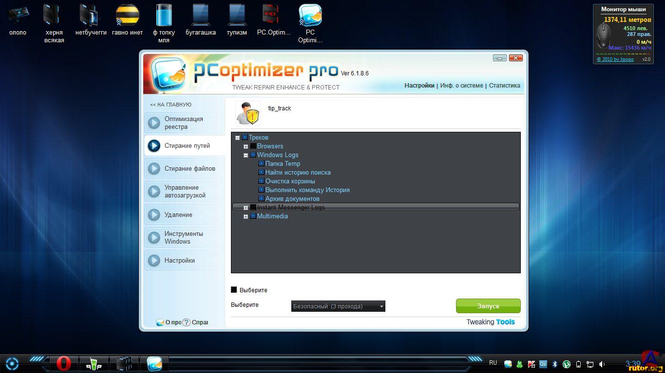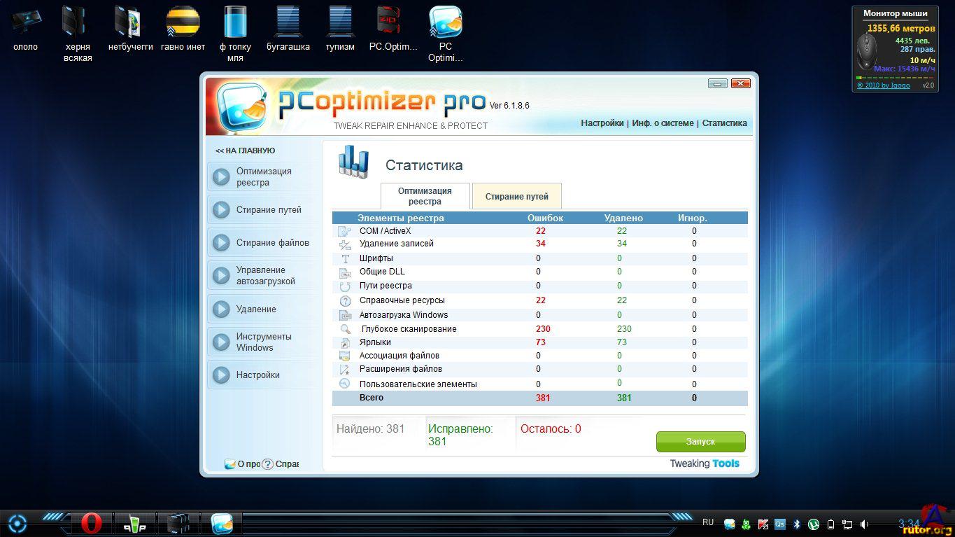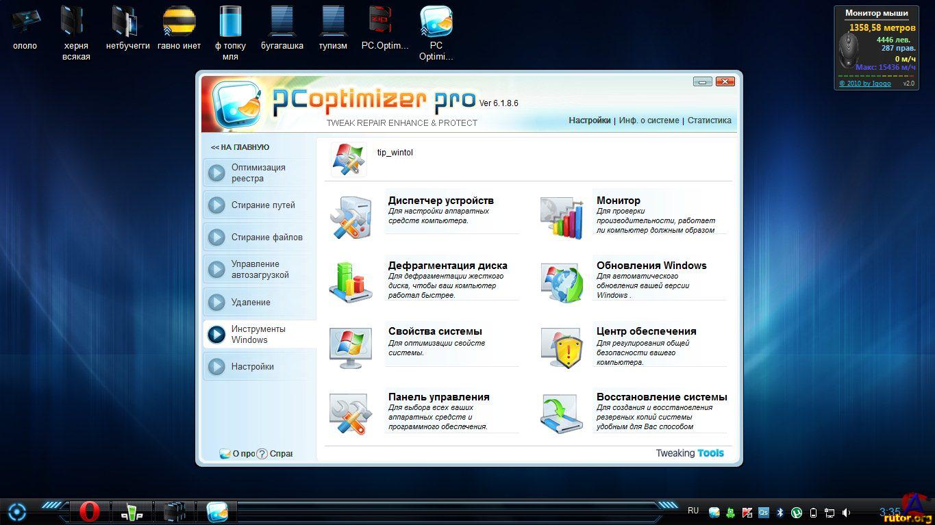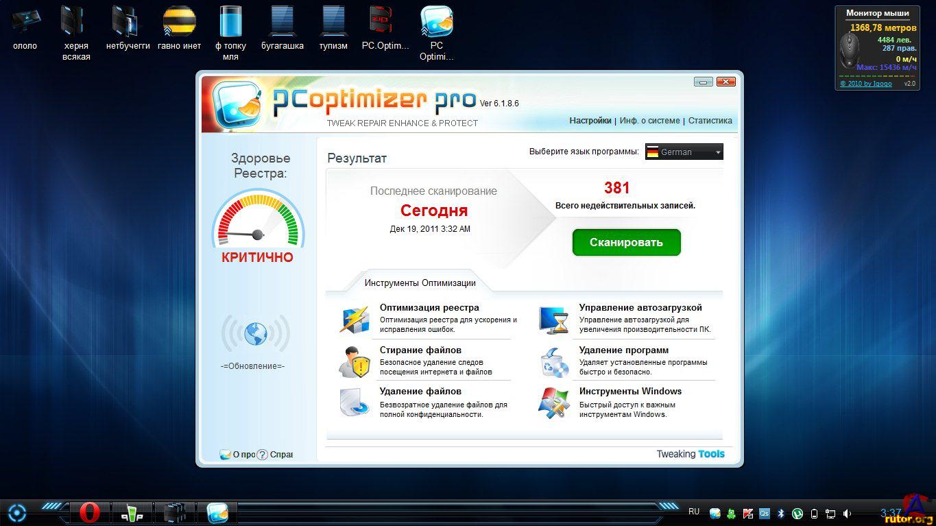 Название: PC Optimizer Pro 6.1.8.6 Тип издания: лицензия Назначение: оптимизация Разработчик: Xportsoft Technologies Год: 2011 Платформа: PC Язык интерфейса: мультиязычный Таблетка: присутствует (патч) Системные требования: Windows XP / Vista / 7 Описание: PC Optimizer Pro - программа для очистки, восстановления и оптимизации операционной системы Windows в несколько кликов мышью. Программа позволяет оптимизировать производительность вашего компьютера, заставляя ваш компьютер работать быстрее, и позволяет исправлять различные ошибки системы, предотвращая до 90% всех сбоев в работе компьютера. Программа состоит из набора системных утилит, которые помогут вам очистить системный реестр и жесткий диск от мусора, удалить ненужные приложения и программы из автозапуска, покажет вам информацию о вашей системе, а также сделает резервную копию на случай сбоя в системе и множество других операций. Основные возможности: Сканирование системного реестра на поиск и исправление неправильной или устаревшей информации Защита вашей конфиденциальности за счет очистки интернет и компьютерной активности Безвозвратное удаление файлов с жесткого диска без возможности их восстановления Удаление программ из вашей системы Менеджер автозапуска для управления приложениями, которые запускаются при старте Windows Отображение важной информации о конфигурации и производительности вашей системы Резервирование всей вашей информации и важных файлов