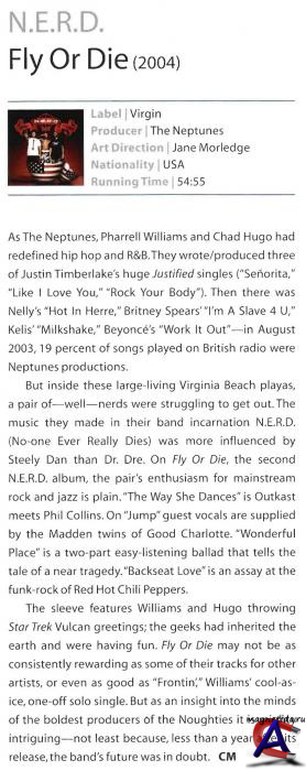 Об альбоме Fly or Die, второй студийный альбом N*E*R*D, вышел в 2004 году. На этот раз участники трио решили отказаться от помощи живой группы, а все необходимые инструментальные партии для Fly or Die записывали сами — «так будет честнее». Исключение составили три композиции, отмеченные присутствием Ленни Кравица (Lenny Kravitz), ?uestlove, Эндрю Коулмана (Andrew Coleman) и участников Good Charlotte. Даже по приглашенным музыкантам можно судить о стилистических истоках второго альбома. В материале нашли отражение классический рок, битловский поп, старый фанк и новая волна. Не говоря уже о родной стихии ритм-н-блюза, хип-хопа и поп-мейнстрима. Несколько прохладный прием первого альбома в Америке музыкантов не разочаровал. Они привыкли долго и упорно идти к своей цели. В случае с самостоятельным творчеством долго ждать не пришлось. Fly or Die попал в американский Тор 10 (под #6) и отметился в первой пятерке лучших ритм-н-блюзовых альбомов. Появился в активе трио и первый хит: трек «She Wants to Move» поднялся на 6 строку танцевального рейтинга.