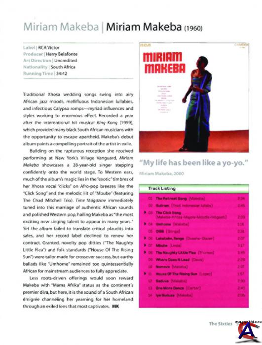 Покинув ЮАР, Мириам Макеба переехала в Лондон, где встретила Гарри Белафонте, который помог ей получить известность и стать знаменитой в Америке. Там она записала многие свои известные хиты, в том числе такие, как «Pata Pata», «The Click Song» («Конгкотвейн», «Qongqothwane» на языке коса), «Малайка». В 1966 году совместно с Гарри Белафонте получила премию Грэмми за лучший альбом в этническом (фольклорном) стиле. Получивший награду альбом An Evening With Belafonte/Makeba (Вечер с Белафонте и Макеба) был посвящён плачевному положению чернокожего населения ЮАР.