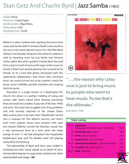 Слово "Босса Нова" часто является синонимом с именем Stan Getz. Но мы никогда не узнали бы яркий звук босса новы, найденный Charlie Byrd. В 1961 Byrd вернулся из тура по Южной Америки, где босса нова была очень успешной музыкой. Стиль есть изобретение певца Joao Gilberto и композитора Antonio Carlos Jobim — смесь Бразильских ритмов самбы с гармоничными структурами и джаз-стиля "cool" Западно-Побережного джаза. Byrd привёз записи Getz для прослушивания, они запланировали сессию и как результат получился первый альбом настоящей босса новы, который привёл к восторженному помешательству и создал волну босса новы в США. Абсолютно необходимый альбом для любой коллекции джаза.