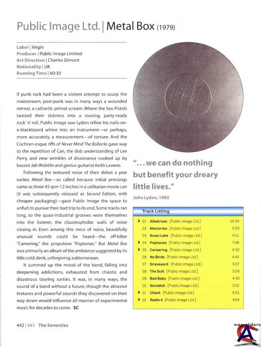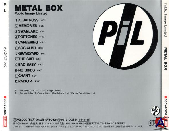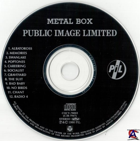 Подробнее Ансамбль был создан Джоном Лайдоном вскоре после того, как он покинул состав Sex Pistols в январе 1978 года: музыкально Лайдон к тому времени уже тяготился рамками стиля Sex Pistols и намеревался писать совершенно другую музыку. В группу вошли также Джа Воббл, не умевший до того играть на бас-гитаре, Кейт Левен, бывший участник The Clash и канадский студент, откликнушийся на объявление о поиске барабанщика. Первый альбом Public Image Ltd записывался в напряжённых условиях: выделенные лейблом деньги на альбом группа быстро растратила по своему усмотрению (в основном, на наркотики и алкоголь), отчего вынуждена была записываться в кратчайшие сроки в плохой студии с разбитыми микрофонами и оборванными мониторами. Это отразилось на материале их первого альбома: песни были записаны в поспешности, без какой-либо подготовки. Альбом с шестью немелодичными, полными хаотических аккордов и шумов песнями и двумя стихами длился 39 минут. Студию и критиков удивил громкий звук бас-гитары. Второй альбом пошёл по стопам первого. Американский лейбл возмутил этот революционный громкий звук бас-гитары и они приказали группе перезаписать альбом. Группа подчинилась и записала заново альбом, но в тайне подсунула в печать старые записи: так вышел альбом Metal Box. В 1988 году группа приезжала в СССР, выступая с концертом в Таллине, после чего (в 1992) прекратила существование. Metal Box — 2-й студийный альбом британского пост-панкового коллектива Public Image Ltd, возглавленного Джоном Лайдоном после ухода из Sex Pistols. Издан фирмой Virgin Records в виде комплекта из 3-х 12-дюймовых пластинок, запакованных в железный ящичек для кинопленки. Позже был переиздан в виде обычного сдвоенного альбома под названием Second Edition (порядок песен на альбоме был при этом изменен). В отличие от радикально-примитивных и агрессивных панк-роковых записей, создававшихся Лайдоном в составе Sex Pistols, «Metal Box» (в чем-то продолжавший линию своего предшественника, дебютного альбома PiL «First Issue») состоял из мрачных, монотонных композиций в духе классического краут-рока c элементами нойза, электроники и конкретной музыки. Нередко альбом называется в числе первых (издан в 1979-м) и самых важных записей в британском пост-панке: в 2003 журнал «Rolling Stone» включил его в число 500 величайших альбомов всех времен под номером 469, Pitchfork Media «присудил» ему 19-е место в своем «Top 100 Albums of the 1980s» («Сто главных альбомов 1980-х»).
