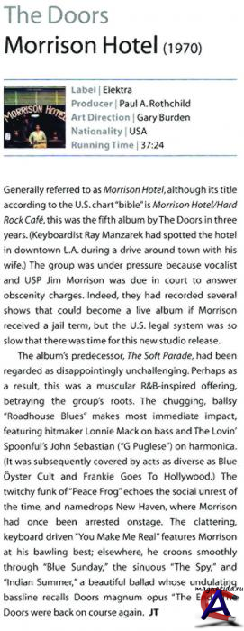 Подробнее Д. Моррисон: Мы начинали с музыки, затем перешли к театру, но всё это было так дерьмово, что мы вернулись к музыке, к тому, с чего мы начинали, когда были простой рок-группой. И музыка стала значительно лучше, сделалась более интересной, профессиональной, композиционно собранной, но мне кажется, публике это не понравилось. Я думаю, она не смогла простить нам того, что во времена, когда мир так и не изменился в одно мгновение под воздействием великого возрождения духа, чувств и революционных настроений, мы по-прежнему играем хорошую музыку Д. Марш «Cream»: „The Doors“ подарили нам самый яростный рок-н-ролл, какой я когда-либо слышал. Когда они в ударе, рядом с ними просто некого поставить. Я убеждён, что это — лучшая пластинка, которую я слышал… до сих пор. Брюс Харрис «Jazz & Pop»: Пятый альбом THE DOORS — совсем не то, чем он кажется на первый взгляд. И любой, кто скажет вам, что группа вернулась к „старому доброму рок-н-роллу“, наверняка перепутал Фабиана с Уолтом Уитменом, или слишком долго слушал THE MOODY BLUES. Нет, THE DOORS возродились, восстановили из пепла многое из утерянного мастерства. Лирика альбома простирается от поэзии до притч. В руках этих музыкантов рок-н-ролл и вся его магия всегда наполнялись жизнью и никогда не нуждались в какой-либо особой трактовке. Все альбомы THE DOORS были насквозь автобиографичны, особенно несправедливо раскритикованный The Soft Parade. Он на самом деле лучше, чем вся эта кошмарная продукция огромного числа тех музыкантов, которые стремятся, чтобы их заметили. Morrison Hotel — при всех его автобиографических отсылках, — тот самый альбом, который действительно является альбомом об Америке… И, пожалуй, нет никаких сомнений, что Отель — одно из самых великих достижений музыки 70-х годов.