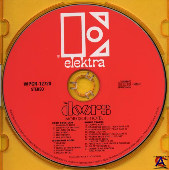 Трэклист Hard Rock Cafe 01 Roadhouse Blues 02 Waiting For The Sun 03 You Make Me Real 04 Peace Frog 05 Blue Sunday 06 Ship Of Fools Morrison Hotel 07 Land Ho! 08 The Spy 09 Queen Of The Highway 10 Indian Summer 11 Maggie M"Gill Bonus Tracks 12 Talking Blues [Previously Unissued] 13 Roadhouse Blues (11/4/69, Takes 1-3) [Previously Unissued] 14 Roadhouse Blues (11/4/69, Take 6) [Previously Unissued] 15 Carol (11/4/69) [Previously Unissued] 16 Roadhouse Blues (11/5/69, Take 1) [Previously Unissued] 17 "Money Beats Soul" (11/5/69) [Previously Unissued] 18 Roadhouse Blues (11/5/69, Takes 13-15) [Previously Unissued] 19 Peace Frog (False Starts & Dialogue) [Previously Unissued] 20 The Spy (Version 2) [Previously Unissued] 21 Queen Of The Highway (Jazz Version)