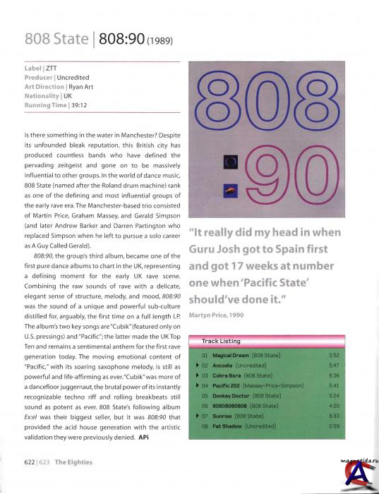 Подробнее Группа 808 State образовалась в 1988 году Bury, Англия. Мартин Прайс (Martin Price) был владельцем музыкального магазина под названием Eastern Bloc, а также основателем независимого лейбла Creed. Покупатель Грэхем Мэсси (Graham Massey) из группы Biting Tongues, и Джеральд Симпсон (Gerald Simpson), присоединились к Прайсу, чтобы сформировать хип-хоп команду Hit Squad Manchester. Вскоре после того как группа переключилась на acid house звучание, они записали свой дебютный альбом Newbuild (1988 году), только уже под именем 808 State. Альбом был выпушен на лейбле Прайса. Симпсон покинул группы в 1989 году и образовал свой собственный сольный проект “A guy Called Gerald”. Его самым большим хитом стала композиция “Voodoo Ray”. Поэтому оставшиеся участники стали сотрудничать с ди-джеями. В 1989 они с Эндрю Бейкером (Andrew Barker) и Дареном Партингтоном (Darren Partington) (известные как Spinmasters), записали EP названный Quadrastate. Их следующий альбом, Ninety, был хорошо принят рейв культурой. MC Tunes (настоящее имя Ник Локет (Nicky Lockett)) – манчестерский рэпер, работал с группой над их альбомом 1990-го года The North At Its Heights. Альбом имел умеренный успех, достигнув 26 места в британских чартах, также были выпущены европейское и японское издания. Он породил три британских сингла: The Only Rhyme That Bites – с использованием сэмпла из композиции "The Big Country" исполняемой The City of Prague Philharmonic — (10 место в UK), Tunes Splits The Atom (18 место в UK) и Primary Rhyming (67 место в UK). Позже, в 1996 году Tunes вернулся, чтобы поработать над новым треком Pump из альбома 808 State Thermo Kings. Композиция должна была выйти как сингл, но этого не произошло. Следующим альбомом 808 State был Ex:el, приглашенными вокалистами на котором стали Бернард Самнер (New Order) и бывшая участница Sugarcubes Бьёрк, также в альбом вошли хиты In Yer Face, Cubik, Olympic & Lift. В 1992 году, Прайс покинул группу ради сольного творчества, в конечном счете, он сформировал свой собственный лейбл Sun Text. Оставшиеся участники выпустили четвертый альбом под названием Gorgeous, после этого, поработав над ремиксами Дэвида Боуи (David Bowie), Soundgarden, и других исполнителей, чтобы в 1996 году вернуться с альбомом Don Solaris. Альбом обозначил перемену для группы, которая хотела уйти от своего известного рейв звучания. На Don Solaris, они поставили себе цель создать более красивый синемаскопический (cinemascopic) звук. В записи альбома принял участие Джеймс Дин Бредфилд (James Dean Bradfield) из Manic Street Preachers, который исполнил вокальную партию на композиции “Lopez”, которая достигла 20 позиции в британских чартах. Браин Ино (Brian Eno) сделал на эту композицию ремикс. На композиции “Bond” вокал принадлежи Майку Доути (Mike Doughty) из группы Soul Coughing, а на композиции “Azura’’ Луизе Родс из Lamb. В 1998 группа выпустила сборник лучших хитов под названием 808:88:98, ставшей их последней записью, выпущенной для лейбла ZTT, а ремикс 98 года на композицию Pacific высоко поднялся в чартах. В 2000 году их новаторский acid house альбом Newbuild был перевыпущен. В 2003 году они выпустили Outpost Transmission, к работе над которым, также были привлечены такие исполнители как Alabama 3 и Гай Гэрви (Guy Garvey) из Elbow