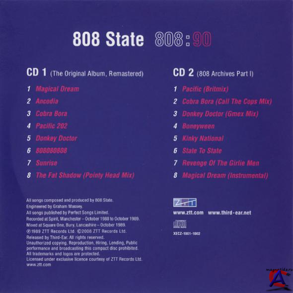 Трэклист The Original Album, Remastered 1.1 Magical Dream 3:52 1.2 Ancodia 5:47 1.3 Cobra Bora 6:36 1.4 Pacific 202 5:41 1.5 Donkey Doctor 5:24 1.6 808080808 4:20 1.7 Sunrise 6:33 1.8 The Fat Shadow (Pointy Head Mix) 0:58 808 Archives Part I 2.1 Pacific (Britmix) 4:23 2.2 Cobra Bora (Call The Cops Mix) 4:53 2.3 Donkey Doctor (Gmex Mix) 4:45 2.4 Boneyween 6:12 2.5 Kinky National 4:01 2.6 State To State 5:56 2.7 Revenge Of The Girlie Men 4:13 2.8 Magical Dream (Instrumental) 5:09