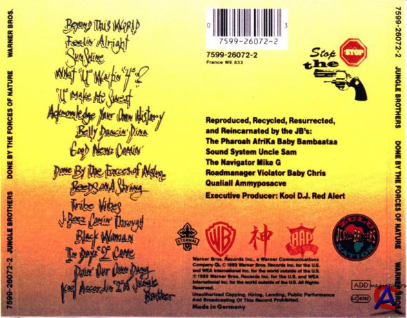 На студии DJ Red Alert группа записала свое первое демо, на основе которого был подписан контракт с диско-лейблом «Warlock/Idler Records». При поддержке все того же DJ Alert группа выпустила свой дебютный диск Straight Out Of Jungle — произведение, отличавшееся смысловой нагрузкой, интеллигентностью и фанковыми корнями. Ведущая роль так называемого «fusion rap» (рэпа, смешанного с другими стилями) стала еще более заметна в их второй работе Done By The Forces Of Nature, которая появилась на «Warner Brothers» после годичного гастрольного перерыва. «Братьям» незачем было греметь толстыми золотыми цепями и облачаться в тренировочные брюки фирмы «Адидас», чтобы заявить о своей исключительности. В пользу последней красноречиво свидетельствовали колкий юмор (в основном на сексуальные темы), национальный позитивизм, меткие социальные комментарии о месте черных в системе, где доминируют «белые» гены и ценности. Группа не считала коммерческий успех своей главной целью, поэтому ее участники свободно экспериментировали без оглядки на вкусы публики. Следующий альбом JUNGLE BROTHERS под рабочим названием Crazy Wisdom Masters получился настолько экспериментальным по своему звучанию, что компания «Warner» побоялась его выпускать. Споры о его «приемлемости» заняли годы. Группу склонили к многочисленным переработкам, наложению модного гангста-звучания. Наконец в 1993 вышел диск под названием J. Beez Wit The Remedy. Маркетинговый просчет «Warner» поставил группу на грань распада. Участники JUNGLE BROTHERS некоторое время занимались своими делами: Майк открыл компанию по производству маек с различной символикой, Эфрика написал музыку для саундтрека «Jason’s Lyric», а Сэмми работал телохранителем. «Если бы не наша многолетняя дружба, то есть если бы мы занимались музыкой только ради денег, — говорит Майк, — мы бы просто разбежались». В 1997 группа собралась вновь, чтобы продолжить создание танцевальной музыки. Некоторые из ее новых произведений, как, например, V.I.P., стали очень популярными на многих танцплощадках Европы.