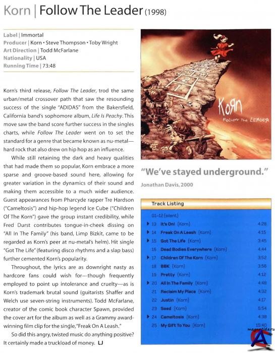 Гнев — на редкость малоприятное чувство. Обычно он приводит к насилию, а то и вовсе к убийству. Но порой лучше просто разозлиться, чем пытаться свести с кем-то счеты. Ярость, презрение и беспомощность могут стереть все лишнее и очистить организм, превратив тебя в нового человека — в этом есть что-то от экзорцизма. И ребята из Korn знают, как пользоваться гневом как эмоцией. Записав «Follow The Leader», вокалист Джонатан Дэвис, бас-гитарист Реджи «Филди» Арвизу, гитаристы Джеймс «Манки» Шаффер и Брайан «Хэд» Уэлч, и ударник Дэвид Сильверия создали идеальный саундтрек для тех до невозможности мрачных дней, когда все, что ты можешь сделать — это лишь заорать во всю глотку: Какого х*я?!