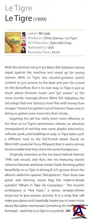 Песня «Hot Topic» на дебютном альбоме Le Tigre — своего рода обращение к феминисткам, таким, как Йоко Оно, Сибо Матто, Арета Фрэнклин, Vaginal Cream Davis, Анджела Дэвис, Sleater-Kinney, Билли Типтон, арт-критик Лора Коттингем, Джеймс Болдуин, Тэмми Рэй Карланд.