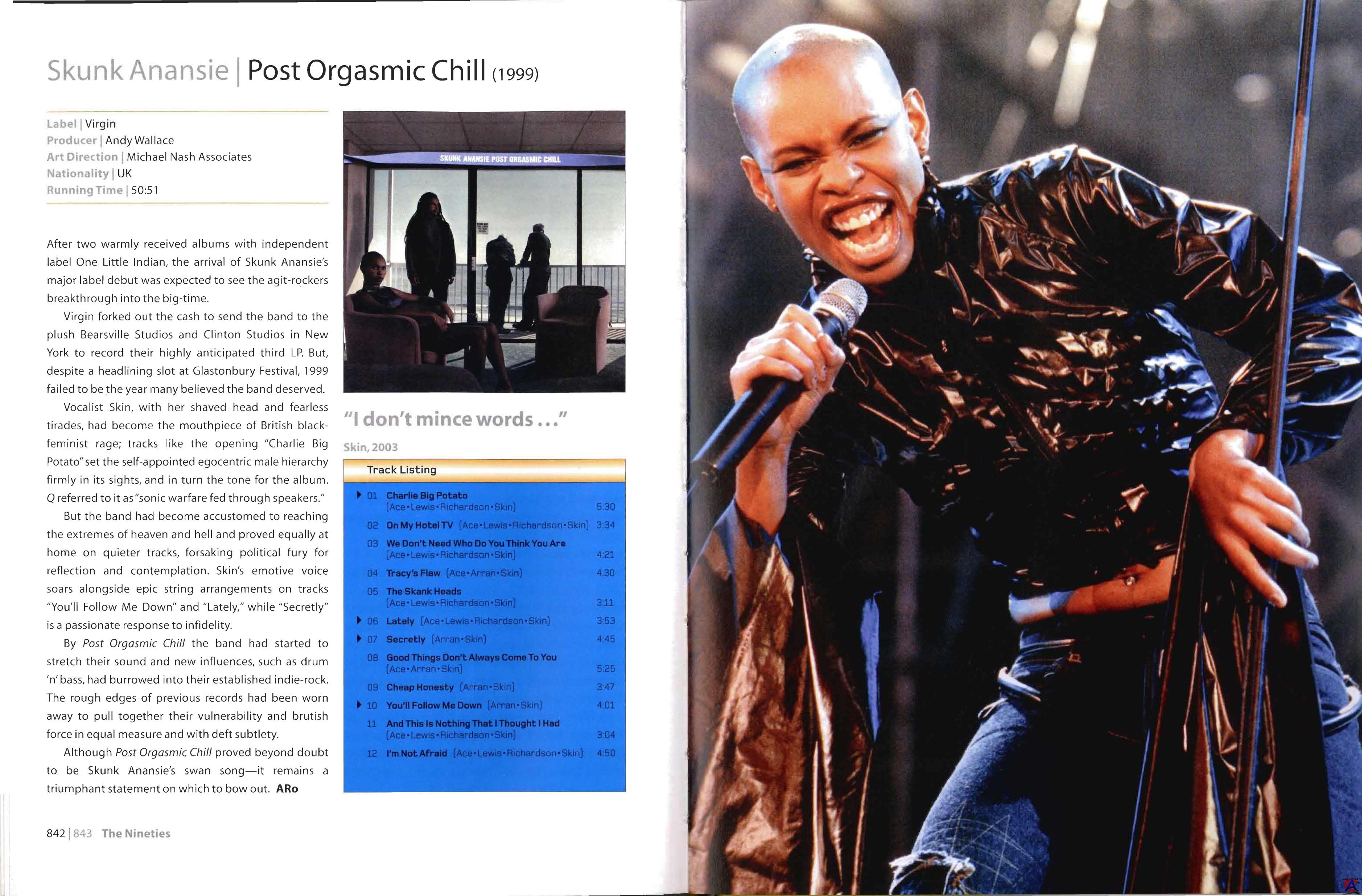 Подробнее Вскоре началась работа над дебютным альбомом Skunk Anansie. Сделанный без особых студийных изысков, «Paranoid Sunburnt», вышел в свет 18 сентября 1995 года, демонстрируя почти живое звучание. Однако он показал настолько совершенную для дебюта смесь фанка, панка, рэгги, госпел и хард-рока, что журнал «Kerrang!» назвал «Скунсов» лучшей новой британской группой 1995 года. Дебютник Skunk Anansie прочно засел в Top-10, а синглы «Weak» и «Charity» — в Top-20. На сцене Skunk Anansie выглядели очень агрессивно, соединяя артистические традиции глиттер-рока 70-х с разнузданностью панков. Со временем индивидуальность самой Скин вышла на первый план. Атлетичная агрессивность в сочетании с кошачьей грацией и артистичной мимикой сформировали ее свой, уникальный концертный образ. После мирового турне Skunk Anansie вернулись домой с новым ударником, т.к. работа Фрэнча давно не устраивала остальных. Им стал Марк Ричардсон, пришедший в группу за две недели до записи сингла «All I Want», после чего все занялись следующим альбомом «Stoosh». Кроме политики, темой многих песен стали вечные темы любви. Таковы «Milk Is My Suga» и «Hedonism (Just Because You Feel Good)». «Stoosh» получился более цельным и глубоким, а также более мягким и лиричным, чем дебютный. Уже по итогам октября диск занял в чартах девятую строчку. Skunk Anansie успешно провели мировое турне вместе с Therapy?, Ленни Кравицем и Bon Jovi. В 1997 году последовали гастроли в Европе и Австралии, а синглы «Hedonism (Just Because You Feel Good)» и «Brasen (Weep)» быстро вошли в Top-20. Известие о том, что «Stoosh» обрел в Британии платиновый статус, «Скунсы» встретили на Диком Западе. Прервав тур, они вернулись на родину для участия в церемонии награждения «MTV Awards» в двух номинациях: «лучшая рок-группа» и «лучшая концертная группа». В мае 1998-го Skunk Anansie подписали контракт о своем переходе на Virgin Records. Работа над третьим альбомом проходила в других, более комфортных условиях. Предваряющий альбом сингл «Charlie Big Potato» сразу оказался в чартах на ведущих позициях. Появившийся 22 марта «Post Orgasmic Chill» не обманул ничьих ожиданий — Skunk Anansie выпустили настоящий шедевр. Сохранив преемственность, музыкантам удалось усилить все элементы синтеза и достичь совершенства в звучании. После его представления группа предприняла мировой тур, продолжившийся до ноября. За это время Skunk Anansie совершила более 80 выступлений в качестве хедлайнера по Европе, Австралии и Северной Америке. Весной 2001 года в прессе появились сообщения, что группа распалась. Участники команды решили, что вместе они сделали уже все, что могли сделать, и теперь им пришло время заняться сольными карьерами. В 2009 году группа объединяется вновь для проведения концертного тура «Greatest Hits Tour». Первые два концерта проходили под псведонимом SCAM (Skin, Cass, Ace, Mark) 2 и 3 апреля в Лондоне, билеты на них были раскуплены за 20 минут с момента начала продажи. На 2 ноября 2009 года намечен выход сборника «Smashes and Trashes», в который помимо старых песен вошли и три новые: «Tear the Place Up», «Because of You» и «Squander». 13 сентября 2010 вышел четвёртый студийный альбом Skunk Anansie «Wonderlustre».