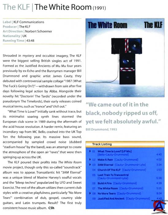 Миллион фунтов наличными, который Билл Драммонд и Джимми Коти предали огню, навсегда останется одним из самых грандиозных перформансов прошлого столетия. Эти двое безумных арт-пассионариев никогда не считали себя музыкантами, да и не были ими. Их роман с поп-индустрией протекал в режиме бесконтрольного хэппенинга: полдюжины псевдонимов, свирепое глумление над беззащитными медиа, несколько синглов № 1, десяток концептуальных провалов и два альбома The KLF, которые вспоминают и поныне. «The White Room», изданный вслед за обморочным эмбиент-шедевром «Chill Out», первоначально задумывался как саундтрек к очередному абстрактному фильму. Первые части этого роуд-муви уже монтировались, когда у художников кончились деньги, полученные за хит «Doctorin" The Tardis», изданный ими под псевдонимом The Timelords. Свернув кинопроект, The KLF переписали и перемикшировали весь оставшийся от саундтрека материал. Приглашенные вокалистки и рэперы особенно усердно поработали над тремя старыми треками, уже выходившими в 80х: «What Time Is Love?», «3 a.m. Eternal» и «Justified And Ancient». В ход пошли также рок-гитары и шум толпы, вырезанный с «Rattle & Hum» U2. Выпущенные синглами, они вошли в Top10 сразу нескольких стран и стали каркасом альбома, который с беспрецедентной яркостью воплотил архетипы едва народившейся электронной музыки. В любом танцевальном хите последующих лет можно разобрать отголоски этих треков. Их разнузданная мощь не поблекла и сегодня, но еще больше впечатляют юмор и спонтанность, переполняющие эту пластинку.