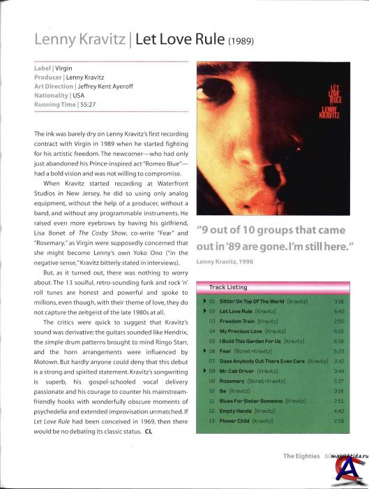 Подробнее Ленни Кравиц (англ. — Leonard Albert Kravitz; род. 26 мая 1964 г., Нью-Йорк, США ) — американский певец, автор песен, мультиинструменталист и продюсер. Его «ретро» стиль соединяет вместе элементы таких музыкальных направлений как рок, соул, фанк, регги, хард-рок, психоделия, фолк и баллады. Четыре года подряд с 1999 по 2002 становился обладателем премии Grammy в номинации «Лучшее мужское рок выступление» («Best Male Rock Vocal Performance»). Суммарный тираж его записей превышает 30 миллионов копий. Ленни Кравитц родился 26 мая 1964 года в Нью-Йорке. Его родители имели непосредственное отношение к миру шоу-бизнеса, поэтому неудивительно, что их ребёнок вырос столь способным и талантливым. Его отец Сай Кравиц был украинским евреем и занимался телепродюсированием, а мать — чернокожая уроженка Багам — была актрисой. Будущая знаменитость с детства увлекалась музыкой. Этому всячески способствовали и его родители, обеспечивая сына записями Джеймса Брауна, Джимми Хендрикса, Сары Воэн и многих других. Увидев заинтересованность Ленни барабанами, родители не поскупились и подарили своему сыну настоящий инструмент. В 1974 семья переезжает в Лос-Анджелес, где Ленни Кравиц отправляется в калифорнийский хор мальчиков. Самостоятельно он начинает осваивать гитару и клавишные и уже через несколько лет заканчивает свое музыкальное образование в Beverly Hills School. Помимо гитары, барабанов и клавишных, Ленни еще играет на многих инструментах, среди которых тромбон, саксофон, тамбурин и губная гармошка. В 1985 году Ленни Кравиц знакомится с актрисой Лайзой Бонэ (играла в «Angel Heart»), которая в 1987-м году становится его женой. Вскоре при финансовой поддержке своего отца, Ленни Кравиц собирает свою студию, где с другом звукорежиссером записывает дебютный альбом. «Let Love Rule» выходит в 1989 и компания Virgin Records, разглядев талант темнокожего исполнителя, подписывает с ним контракт. Параллельно с музыкальным успехом Ленни, в его семейной жизни начинается разлад. В 1991 супружеская пара расстаётся, а через несколько лет и вовсе разводится. От этого брака у музыканта осталась дочь Зоя. Неприятности личного характера — хороший стимул для творчества. Ленни начинает работать над своим вторым альбомом, где отражает всю боль утраты семейного счастья. Выход альбома «Mama Said» приходится именно на момент расставания — 1991 год. Следующий альбом музыканта «Are you gonna go my way», который выходит в 1993 году, многие склонны считать лучшим. За ним, в 1995 — следует альбом «Circus» и критики отмечают у исполнителя явный кризис жанра. Ленни Кравиц делает перерыв. Небольшой. Длиной в три года. В 1998 он выпускает свой пятый альбом, который так и называет «5». В этой работе, в отличие от своих предыдущих альбомов, музыкант использует большое количество различных сэмплов, звуковых технологий и прочих новомодных штучек. Песня «Fly Away» из этого альбома облетает весь мир и получает награду Grammy в категории «Лучший мужской рок -вокал». Как говорит сам музыкант, эта песня буквально перевернула его жизнь, она была написана очень быстро, к тому времени альбом был уже практически готов. Ленни Кравиц записал ее в течение одного дня и буквально заставил лейбл разместить песню на альбоме, хотя компания и убеждала его, что уже поздно что-либо менять. В 2001 году выходит шестая студийная работа музыканта с одноименным названием. Альбом «Lenny» становится очере