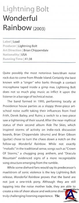 Рецензия на альбом Жила-была-играла-триповала в Сан-Франциско в конце 60-х группа Blue Cheers. Эта бравая банда задецибеленных психонавтов играли, по тем временам, очень громко и задорно, за что и были удостоены звания «the single most powerful band I"ve ever seen» самим мистером Моррисоном. Парни из Blue Cheers, как никто из их калифорнийских собратьев, были преданы идее звуковых перегрузок и прифузованных виражей. Мания предельного выкручивания регуляторов вправо достигла апогея при записи альбома “Outsideinside” в 1968 году. С тех пор вечным примером истового служения духу безудержного драйва и заветом будущим стоунер-революционерам остались выведенные из строя студийные мониторы и прорванные барабанные перепонки гитариста Лея Стефенса (Leigh Stephens). В 90-х у Blue Cheers нашлись достойные последователи, не убоявшиеся электромагнитного жала и уверенно раскручивающие маховик звукового давления. Это двое безумцев из города Провиденс, штат Род-Айленд: басист Брайан Гибсон (Brian Gibson) и барабанный мастер Брайан Чипэндейл (Brian Chippendale), а их совместное драм-н-басовое шумовое детище, со знанием дела, наименовано Lightning Bolt. К Lightning Bolt в полной мере относится банальная народная мудрость о сотнях прослушиваний и об одном моменте визуального созерцания. Парни прославились неимоверными по драматическому напряжению концертными перформансами. Секрет прост, т.н. "guerrilla gigs" представляют собой активное музицирование вне сцены: посреди тесного кружка зрителей, со всеми вытекающими отсюда последствиями. Иногда группа устраивает сумасшедшие акты на улицах, парковках, или даже на кухнях. Последнюю ситуацию аудиально даже страшно представить, так как Брайан Гибсон любитель неимоверной громкости. Его любовь исчисляется 3 000 Ваттами плотного басового напора, что составляет программу минимум для вечеринки от LB. В свою очередь, ударник Чипэндейл (уже, по некоторым данным, имеющий проблемы со слухом) покрывает гитарную лаву вереницей непредсказуемых сногсшибательных барабанных трелей и сбивок, работая в режиме нон-стоп. Также, он выполняет обязанности вокалиста, покрикивая, время от времени, в микрофон, завернутый в носок и заткнутый в маску, которая, в свою очередь, надета на его голову. Для пущего азарта ребята часто прогоняют извлеченные звуки через разнообразные эффекты. Таким образом, эти молниеносные парни будоражат сознание и атакуют уши слушателей уже почти 15 лет. Образовавшись как трио в 1995 году, и сократившись до дуэта через два года, Lightning Bolt поначалу были исключительно импровизационным проектом. Подпитанные японским гитарным нойзом начала 90-х, Брайаны уверенно влились в контекст наэлектризованной плазмы шумовой кометы, вместе с другими представителями американской нойз-роковой сцены конца тысячелетия, такими как, например, Black Dice. Со временем, и с новыми, выпущенными на лейбле Load, альбомами («Lightning Bolt» — 1997 года и «Ride the Skies» — 2001) LB находят собственный оригинальный маршрут. Психо-энергетическое биение их музыки разошлось в полную силу в начале 2000-х и с неимоверной силой влияния запечатлено альбомом Wonderful Rainbow, вышедшим в 2003 году. Данный релиз явился органическим сплавом хаотического импровизационного начала, из которого росла музыка группы, и экспериментов с размерным структурированием композиционного полотна, характерного для т.н. math рока. Собственно, из этого и определяются две ос