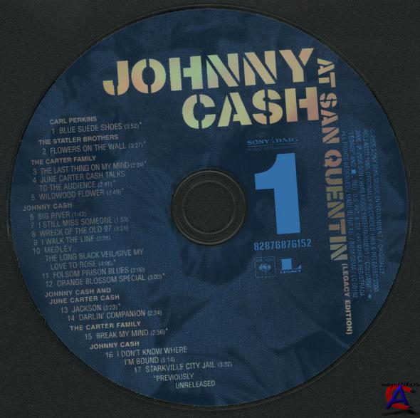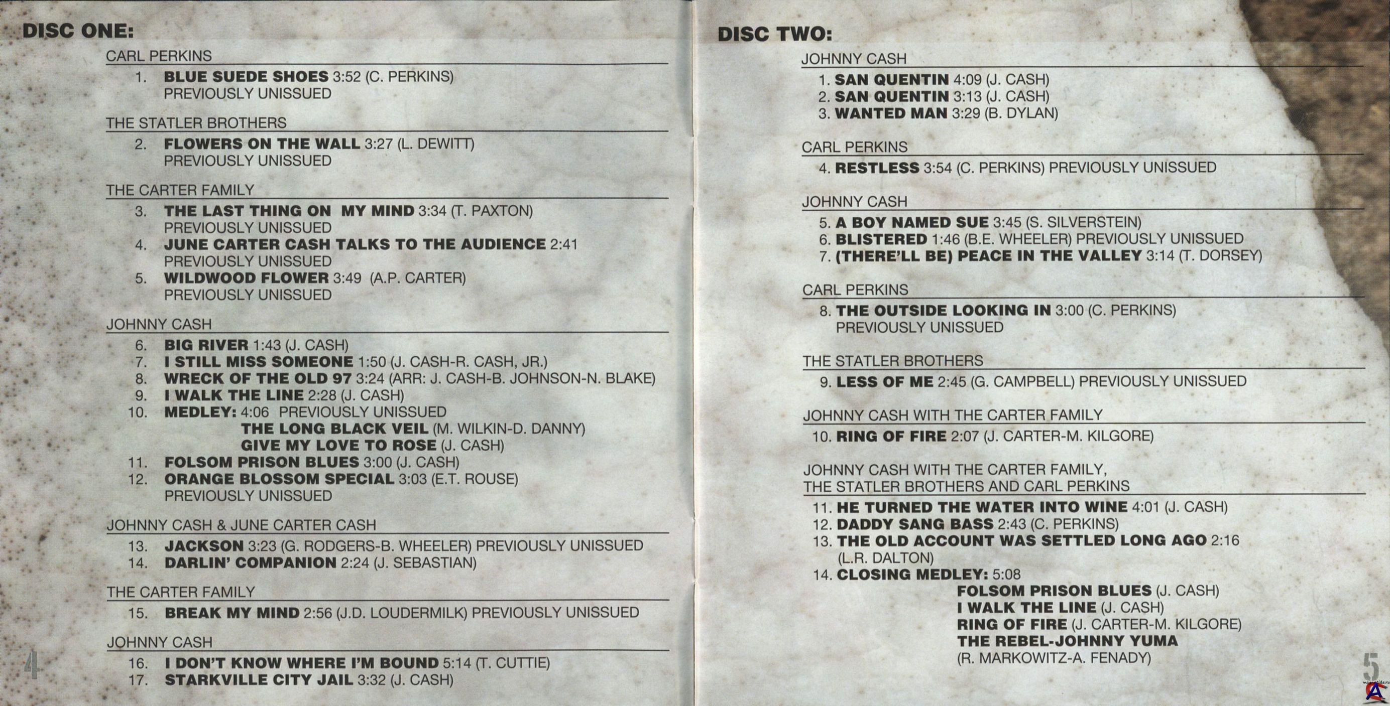 Трэклист CD1 CD1-1 Carl Perkins – Blue Suede Shoes 3:52 CD1-2 Statler Brothers, The – Flowers On The Wall 3:27 CD1-3 Carter Family, The – The Last Thing On My Mind 3:34 CD1-4 Carter Family, The – June Carter Cash Talks To The Audience 2:41 CD1-5 Carter Family, The – Wildwood Flower 3:49 CD1-6 Johnny Cash – Big River 1:43 CD1-7 Johnny Cash – I Still Miss Someone 1:50 CD1-8 Johnny Cash – Wreck Of The Old 97 3:24 CD1-9 Johnny Cash – I Walk The Line 2:28 CD1-10 Johnny Cash – Medley: The Long Black Veil / Give My Love To Rose 4:06 CD1-11 Johnny Cash – Folsom Prison Blues 3:00 CD1-12 Johnny Cash – Orange Blossom Special 3:03 CD1-13 Johnny Cash & June Carter Cash – Jackson 3:23 CD1-14 Johnny Cash & June Carter Cash – Darlin Companion 2:24 CD1-15 Carter Family, The – Break My Mind 2:56 CD1-16 Johnny Cash – I Don"t Know Where I"m Bound 5:14 CD1-17 Johnny Cash – Starkville City Jail 3:32